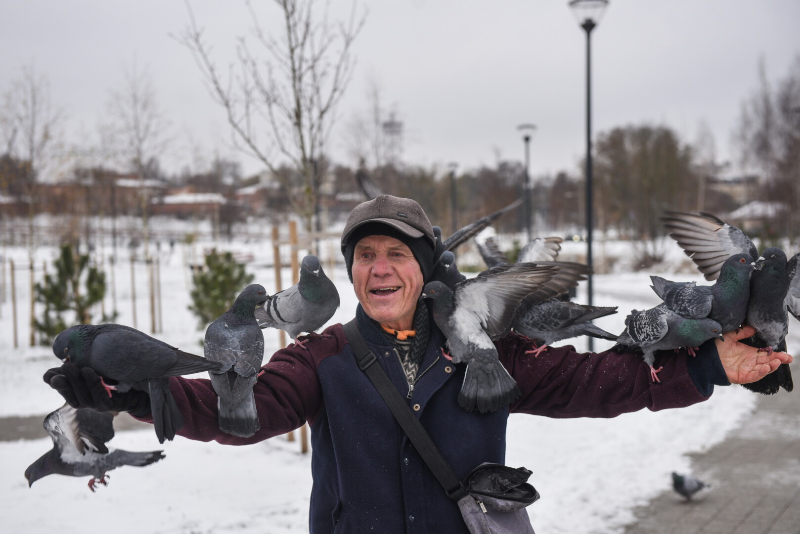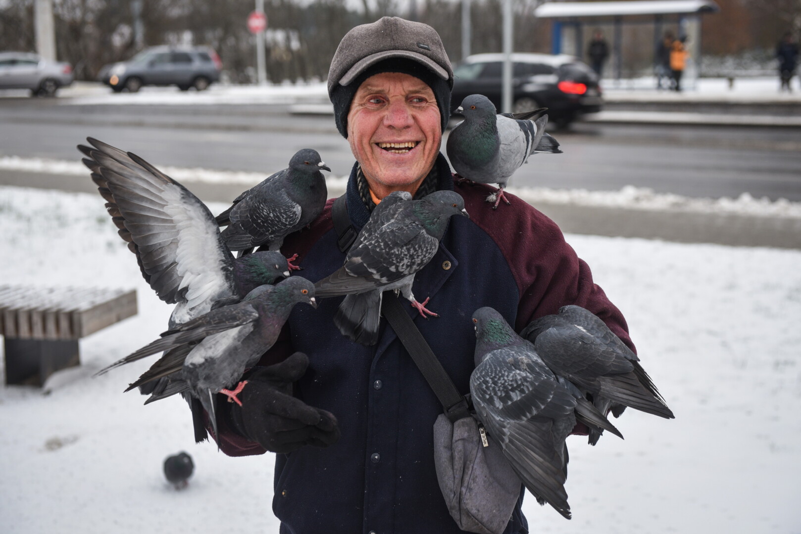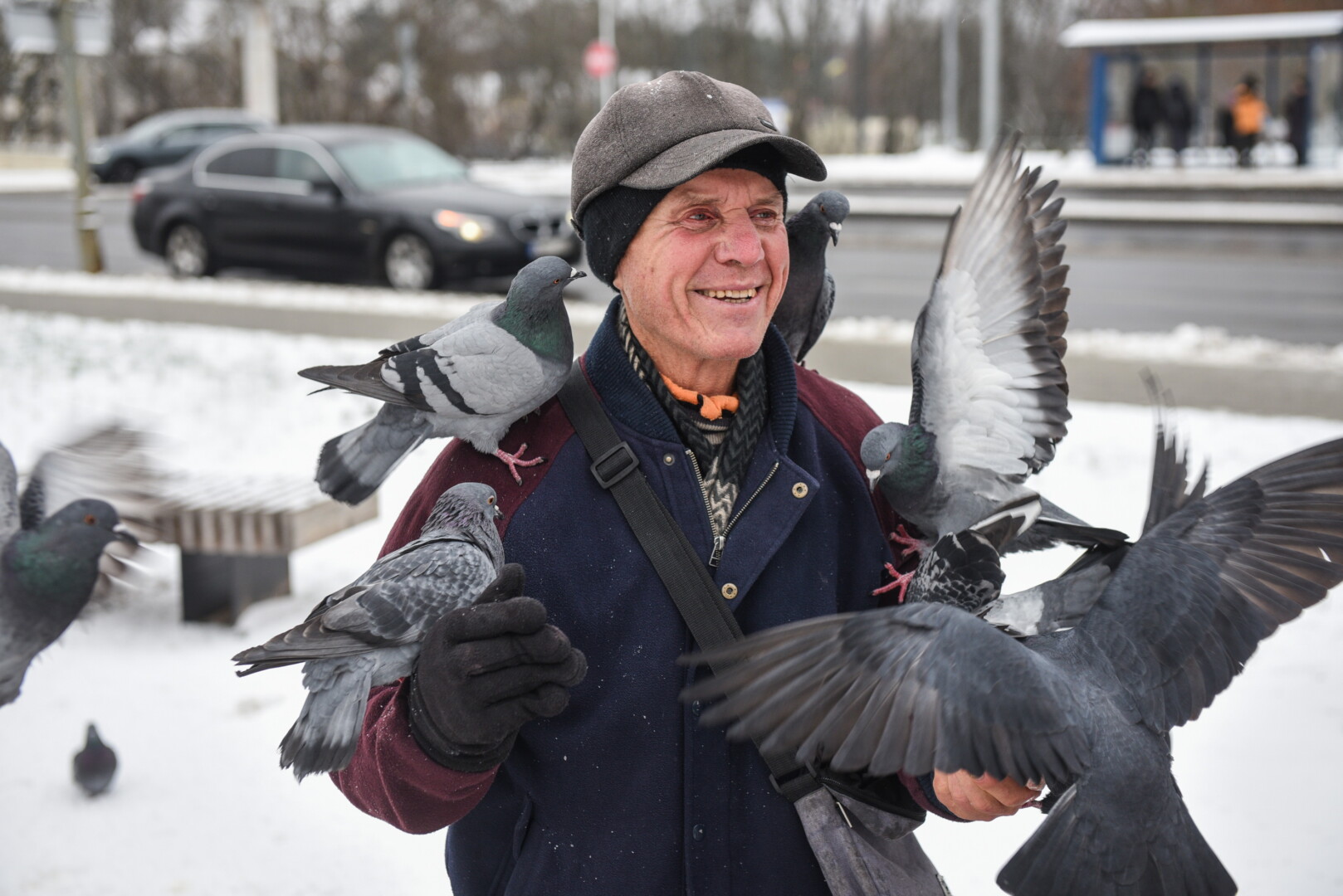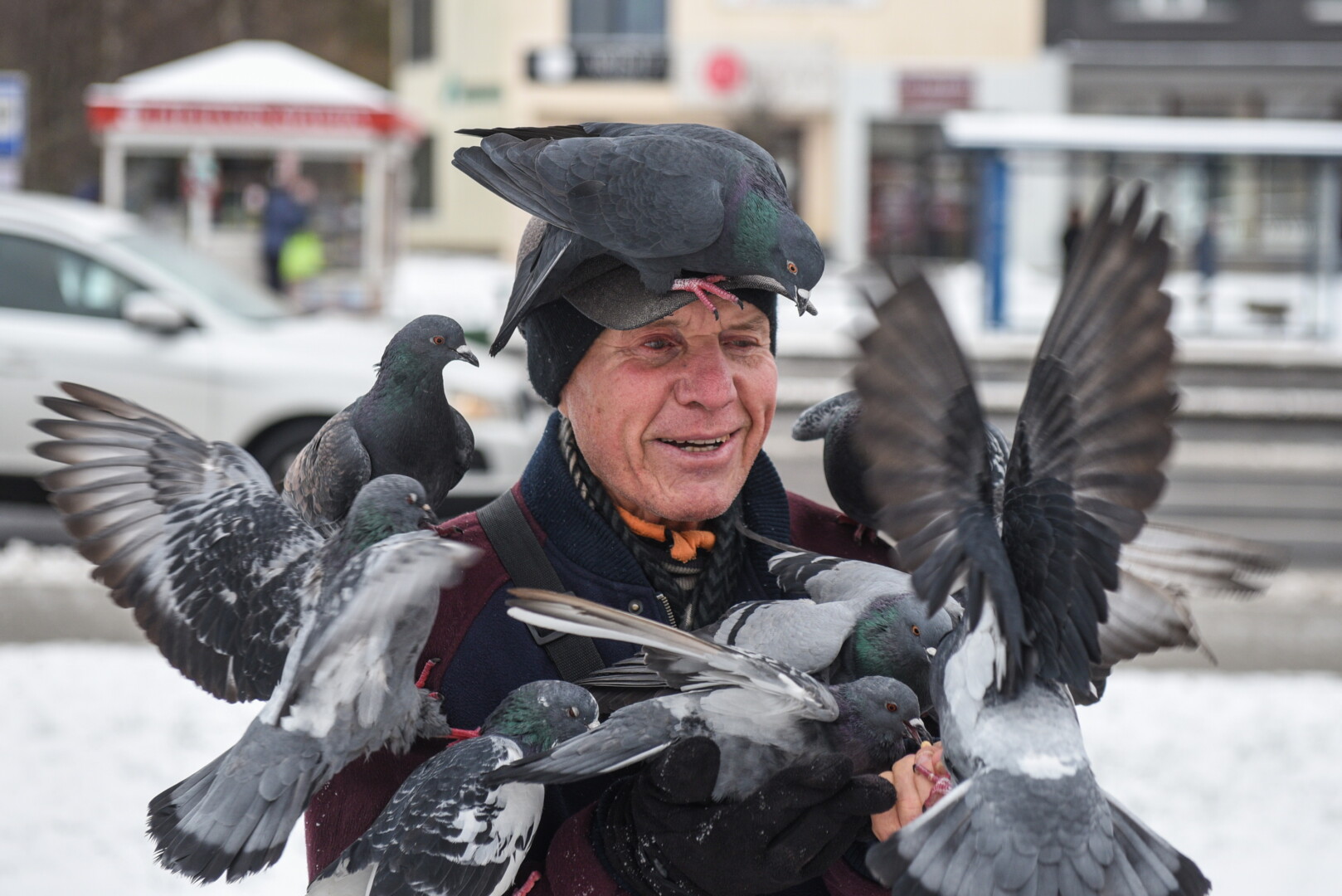 Balandžiai ratu apspitę savo geradarį taip ir laukia, kol šis pravers rankinę, pilną skanėstų. Drąsiausieji tupia savo globėjui ant galvos, pečių, rankų, netgi nesibodi snapo įkišti giliau į rankinę. Ir nieko nuostabaus, mat juos senjoras palepina ne tik grūdais ar kruopomis, bet ir avinžirniais ar saulėgrąžų sėklomis.