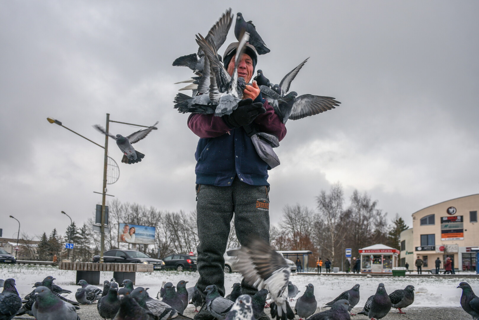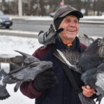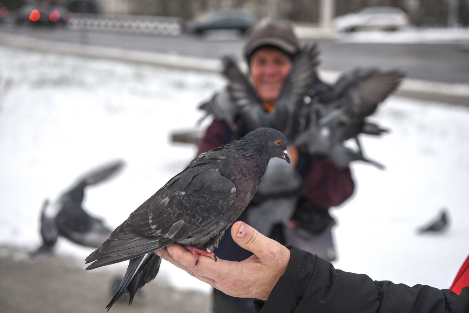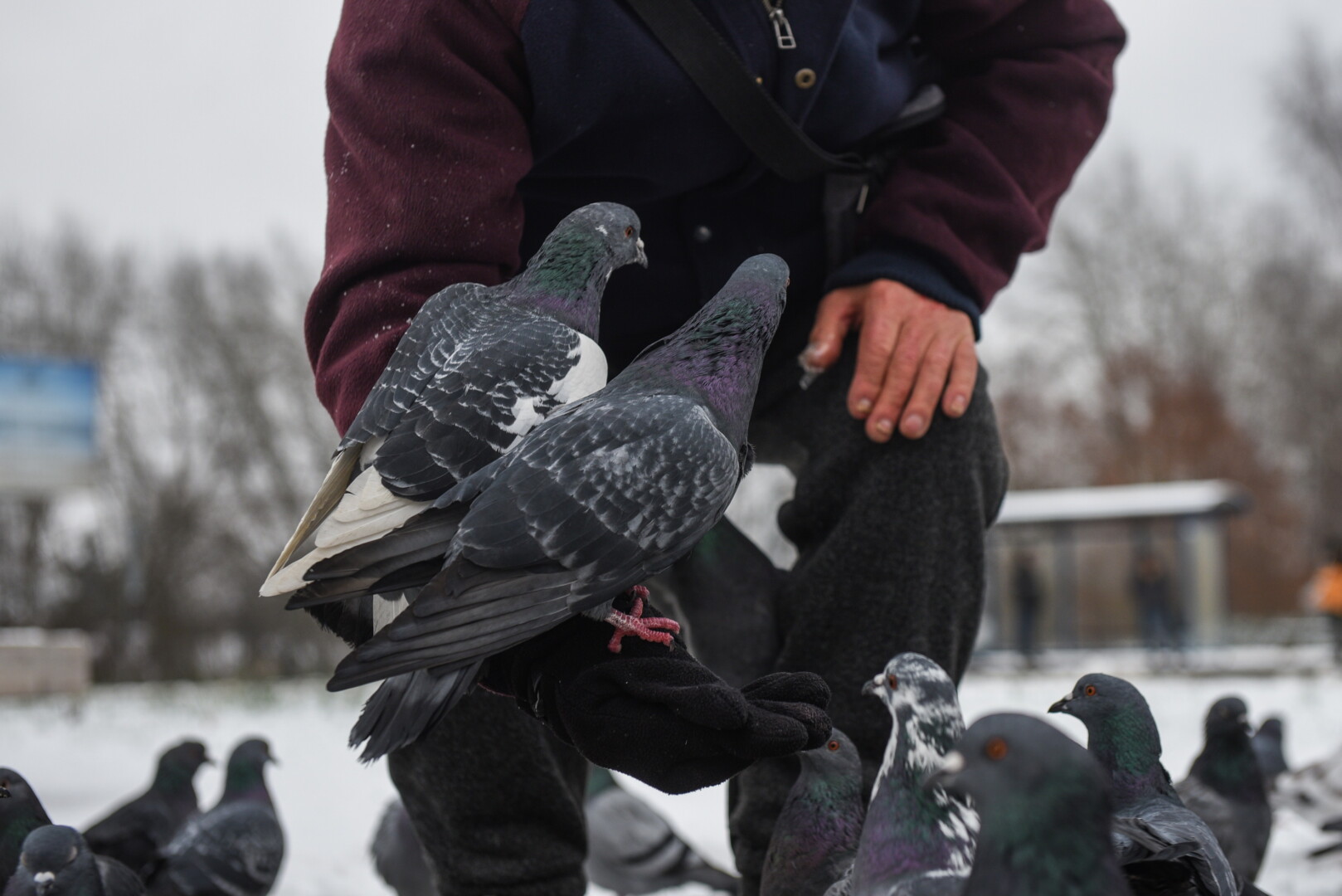 Balandžiai ratu apspitę savo geradarį taip ir laukia, kol šis pravers rankinę, pilną skanėstų. Drąsiausieji tupia savo globėjui ant galvos, pečių, rankų, netgi nesibodi snapo įkišti giliau į rankinę. Ir nieko nuostabaus, mat juos senjoras palepina ne tik grūdais ar kruopomis, bet ir avinžirniais ar saulėgrąžų sėklomis.
