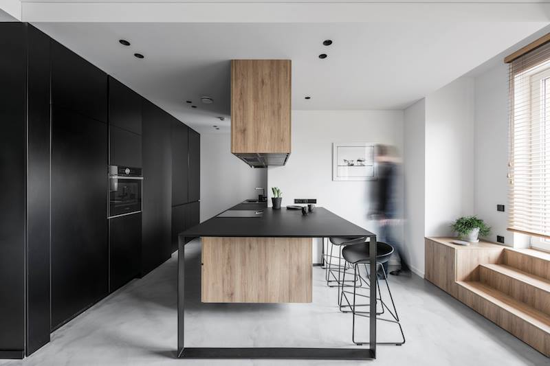 J. Žibūdienė atskleidžia, kad prie šaldytuvo paslėptas stalviršis su pagrindiniais smulkiais prietaisais: plakikliais, kombainais, kavos aparatu ir virduliu. „Tai tarsi papildoma virtuvės niša, kurią uždarai, kai norisi tvarkos“, – sako ji. Virtuvės salą projektuotojai orientavo į langą, kepimo dalį – į pašnekovą, sėdintį prie baro.