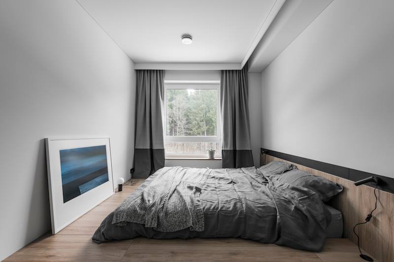 „Saikas ir minimaliai atvira erdvė yra šio interjero sąlyga“, – pabrėžia J. Žibūdienė. Netradicinis požiūris į miegamojo erdvę – ryškiausias šios sąlygos išpildymo pavyzdys. Pamatę, kad pastačius normalaus dydžio lovą praeiti lieka tik siauri tarpai, projektuotojai ją sukonstravo pakyloje.