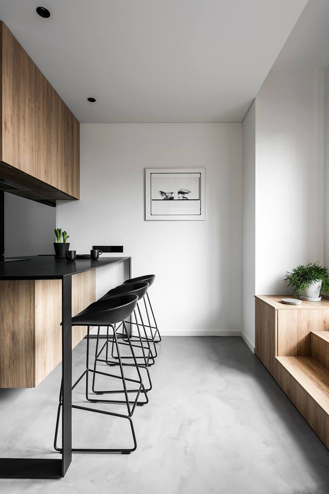 Interjerui vientisumo suteikia skirtingu santykiu patalpose kartojamos tos pačios medžiagos. Medis, atsveriantis šaltą betono paviršių, taip pat buvo vienas iš šeimininkų pageidavimų. Šia medžiaga kūrėjai padengė sienų plokštumas, po ja paslėpė spintas, sukūrė lovos pakylą.