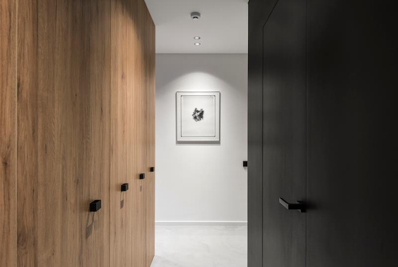 Kontrastui pabrėžti kūrėjai pasirinko juodą spalvą. Buto duris architektė vadina „nematomomis“. Pagal sumanymą jos turi būti kuo mažiau matomos lygiose sienų plokštumose.