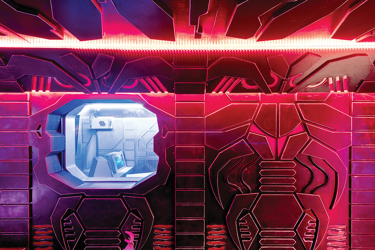 Ateivių kabiną nuspręsta išdažyti juoda spalva ir joje įrengti ryškiai raudoną apšvietimą. Čia vyrauja organiškos detalės, fantastinių grobuoniškų gyvūnų fragmentai. „Žemiečių kabinoje visos sienos – sidabrinės metalo spalvos, mėlynas apšvietimas, dominuoja tvarkingas techno stilius. Laukiamajame palaikoma kosmoso tematika, visa erdvė artimesnė Žemės gyventojų kabinos dizainui“, – skirtingą koloritą komentuoja interjero dizaineris. Anot jo, spalvų pasirinkimui įtakos turėjo žaidimo idėja, patalpų specifika: „Svarstėme įvairius spalvinius variantus – buvo ir nespalvotų, ir kosminių melsvų, žalių, turkio atspalvių derinių pasiūlymų. Bet galiausiai užsakovų pageidavimu pasirinkome ryškesnes ir gyvybingesnes spalvas.“