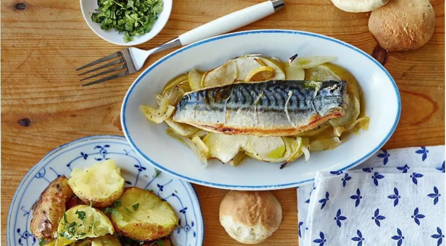 Reikės (4 porcijoms): 2 didelių skumbrių, 1 žaliojo obuolio, 1 nedidelio svogūno, ketvirtadalio citrinos, 200 ml šviesių obuolių sulčių, 50 g sviesto, 4 kadagio uogų, 4 kvapiųjų pipirų, šviežiai maltų juodųjų pipirų, druskos, keptų bulvių – patiekti.