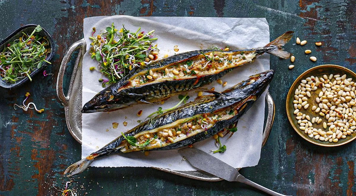 Reikės (4 porcijoms): 4 šviežių neskrostų skumbrių (po 250 g), 2 baltųjų svogūnų, 3 šaukštų razinų, 40 g kedrinių pinijų arba anakardžių, 1 nedidelio ryšelio petražolių, alyvuogių aliejaus, žiupsnelio cinamono, druskos, šviežiai maltų juodųjų pipirų.