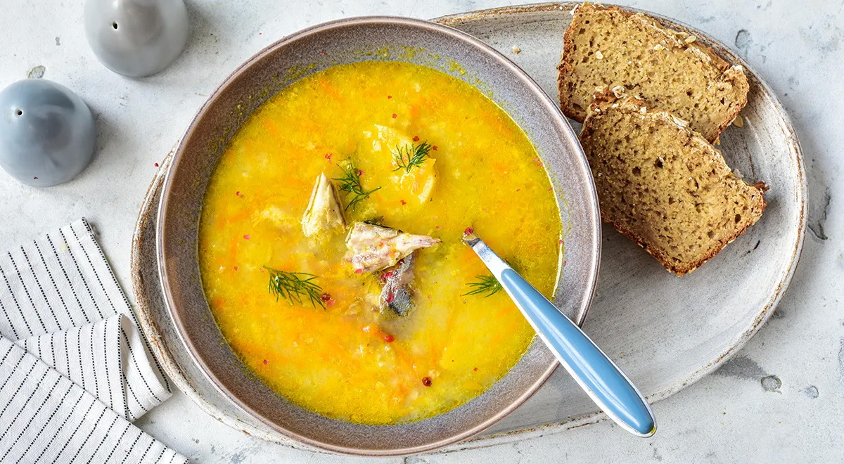 Reikės (8 porcijoms): 500 g šaldytų skumbrių, 3 litrų vandens, 2 lauro lapų, 2 kvapiųjų pipirų, 150 g svogūnų, 100 g morkų, 2 šaukštų aliejaus, 400 g bulvių, 45 g sorų (galima pakeisti ryžiais arba perlinėmis kruopomis), druskos, šviežiai maltų juodųjų pipirų.