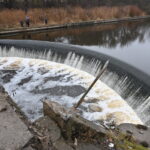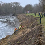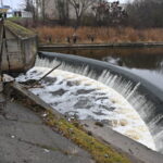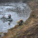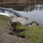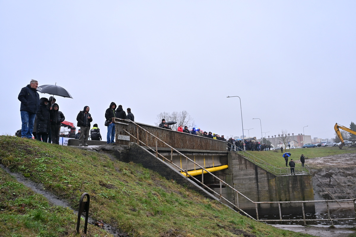 Prieš kelias valandas uždarius Ekrano marių užtvanką, vanduo šioje Nevėžio vietoje ėmė pamažu slūgti, po juo ryškėja automobilio siluetas.