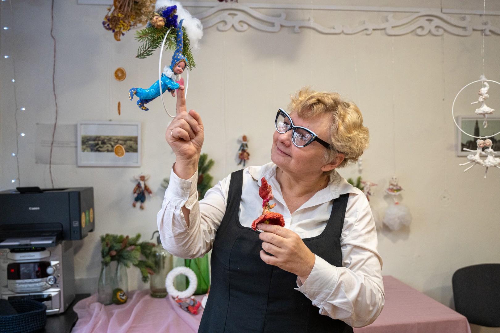 „Jei iš karto nepabaigi, darbas ir neišeina – išmesti gaila, o degti krosnyje jau nebegalima. Gaminys iš vatos ar kitos technikos neįpareigoja. Jeigu tą vakarą ir nepabaigei, gali prisėsti vėliau“, – pasakojo kalėdinių žaisliukų kūrėja.