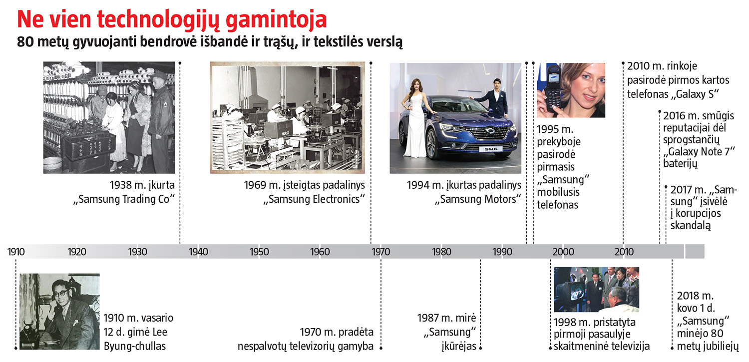 Prekės ženklas „Samsung“ pirmiausia siejamas su aukštosiomis technologijomis, ypač – išmaniųjų telefonų, televizorių ir kompiuterių. Vis dėlto 1938 m. Pietų Korėjoje, Tegu mieste, 28-erių verslininko įkurta bendrovė savo istoriją pradėjo visai ne nuo to. L. Byung-chullas ėmėsi žemės ūkio produkcijos eksporto į Kiniją, vėliau – ir tekstilės bei trąšų verslo. Tik praėjusio amžiaus 7-ajame dešimtmetyje buvo įkurtas padalinys „Samsung Electronics“, reikšmingai pakeitęs bendrovės istoriją.