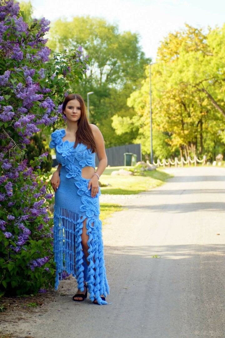 Vienas įdomiausių Tomos mezginių – mokyklos išleistuvėms nusimegzta suknelė. Ne iš parduotuvės, ne siuvykloje siūta, o jos pačios rankomis kantriai kurta pusantro mėnesio.