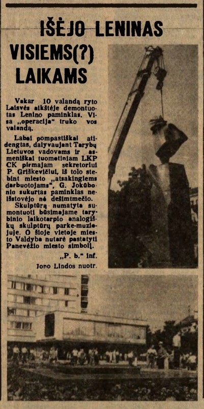 „Labai pompastiškai atidengtas, dalyvaujant Tarybų Lietuvos vadovams ir asmeniškai tuometiniam LKP CK pirmajam sekretoriui P. Griškevičiui, iš tolo stebint „atsakingiems miesto darbuotojams“, G. Jokūbonio sukurtas paminklas neišstovėjo nė dešimtmečio. Skulptūrą numatyta sumontuoti būsimajame tarybinio laikotarpio analogiškų skulptūrų parke-muziejuje. O šioje vietoje miesto Valdyba nutarė pastatyti miesto simbolį“, – trumpai rašyta.
