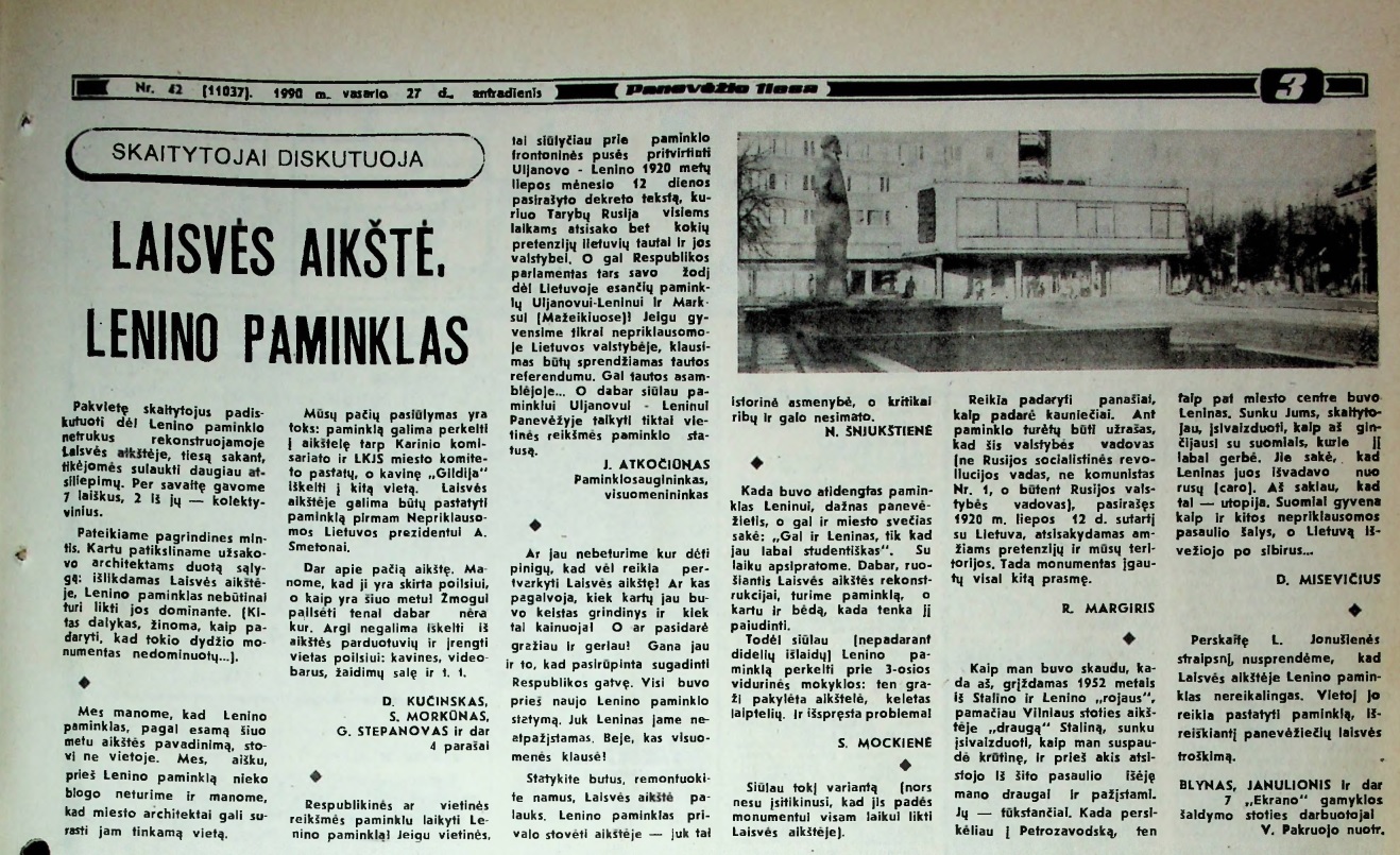 „Pakvietę skaitytojus padiskutuoti dėl Lenino paminklo netrukus rekonstruojamoje aikštėje, tiesą sakant, tikėjomės sulaukti daugiau atsiliepimų. Per savaitę gavome 7 laiškus, 2 iš jų – kolektyvinius“, – rašyta „Panevėžio tiesoje“.