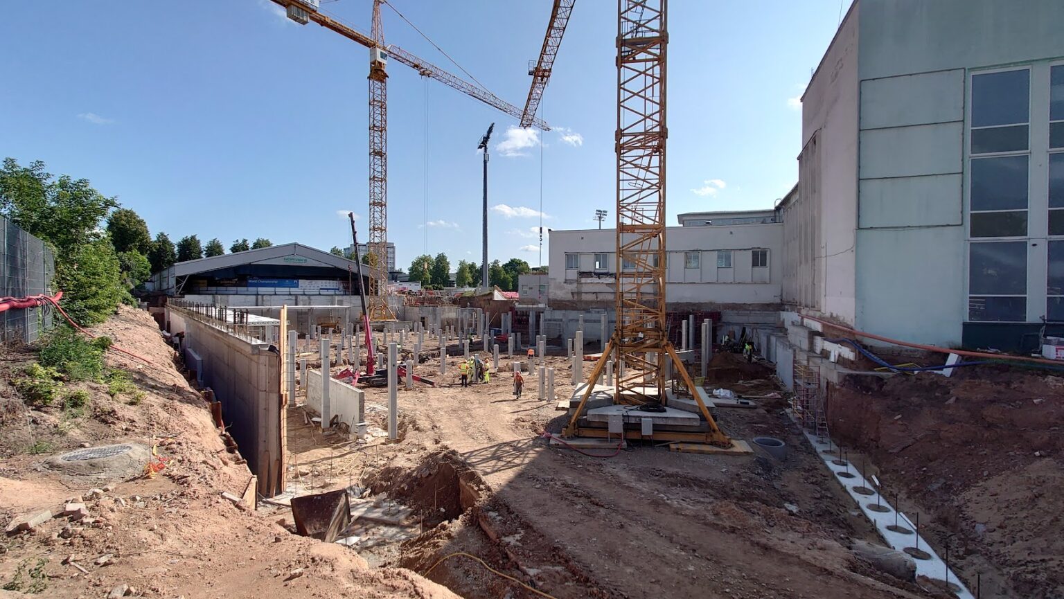 Šiuo metu jau įrengti pamatai ir atraminės sienos, 50 metrų ilgio baseinui laikyti sumontuotos surenkamos gelžbetonio kolonos, virš baseino techninių patalpų pradėti surenkamos gelžbetonio perdangos montavimo darbai, ruošiami pagrindai prieš betonuojant baseiną laikysiančią plokštę.