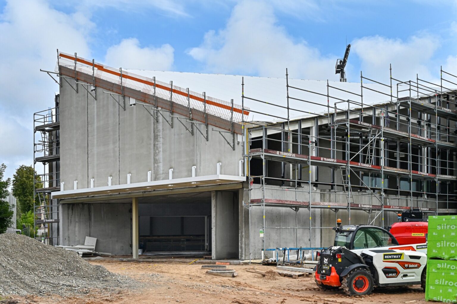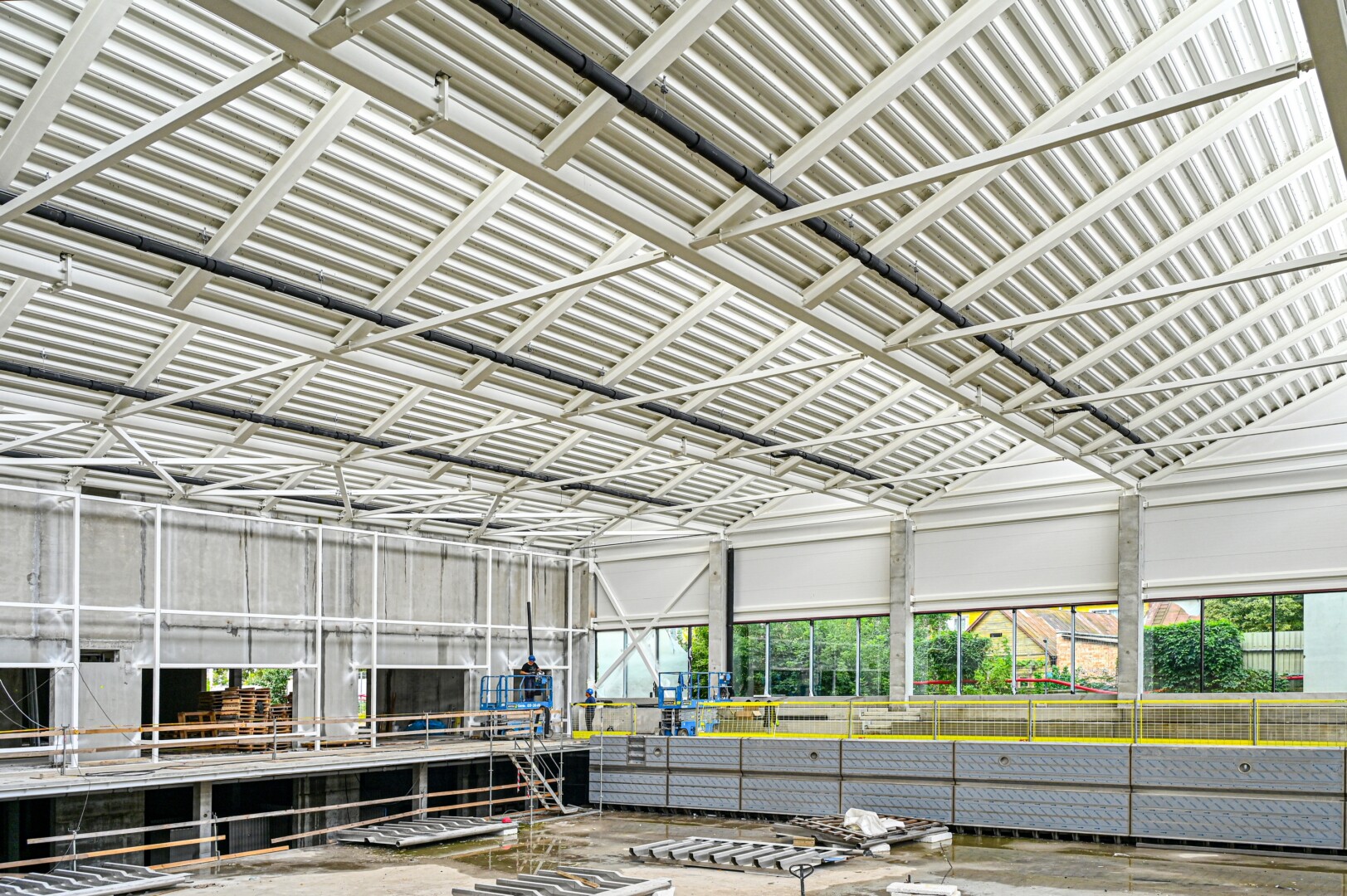 Dabar naujojo pastato viduje įrengiamos inžinerinės dalys – montuojami vėdinimo ortakiai, lietaus vandens nutekėjimo sistemos. Baigiama atlikti pastato konstrukcijų priešgaisrinio dažymo darbus, montuojamas apdailinio fasado laikantysis karkasas, baseino sienų konstrukcijos, atliekami darbai, kad būtų galima montuoti vandens paruošimo technologinę įrangą, šiltinamas stogas, įrengiama hidroizoliacija, montuojamos stogo aliumininio stiklo vitrinos.