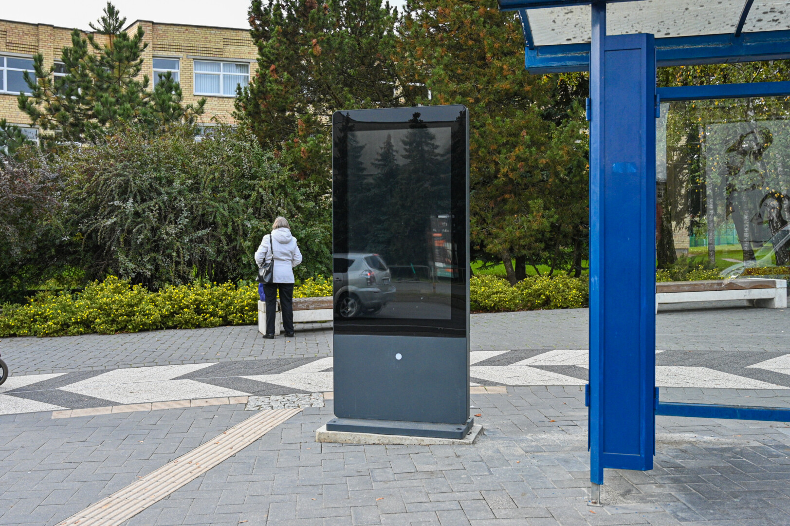 Ekrano viršuje bus rodomi atvažiuojančių autobusų grafikai, laikas iki autobuso atvykimo. Apatinėje dalyje – informacija apie miestą ir susisiekimą jame.