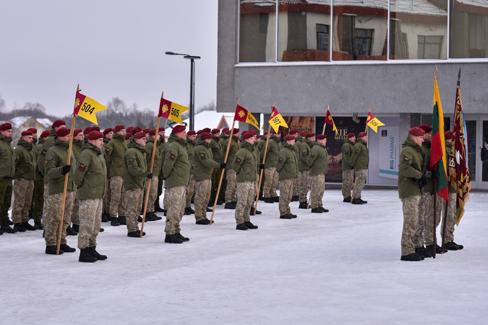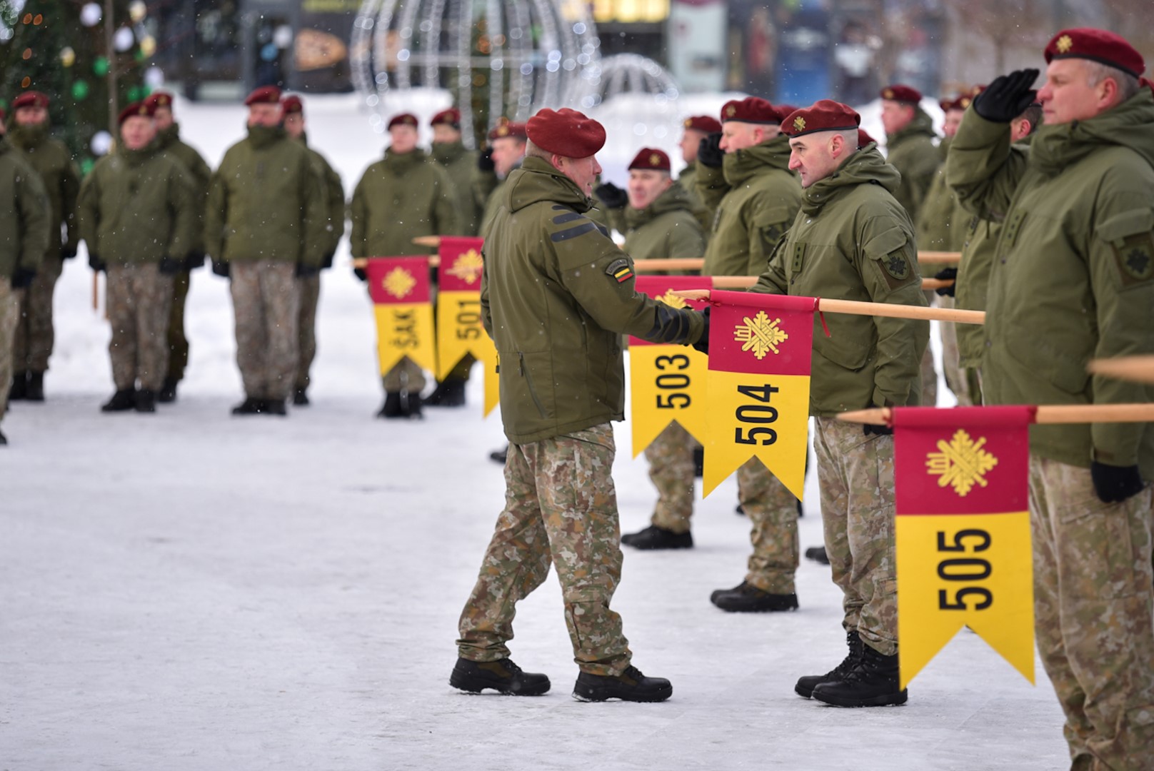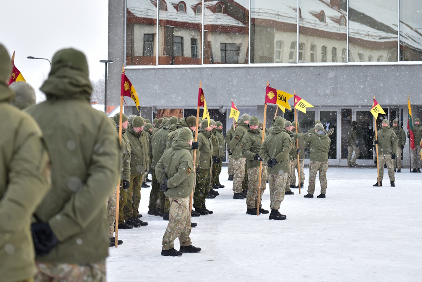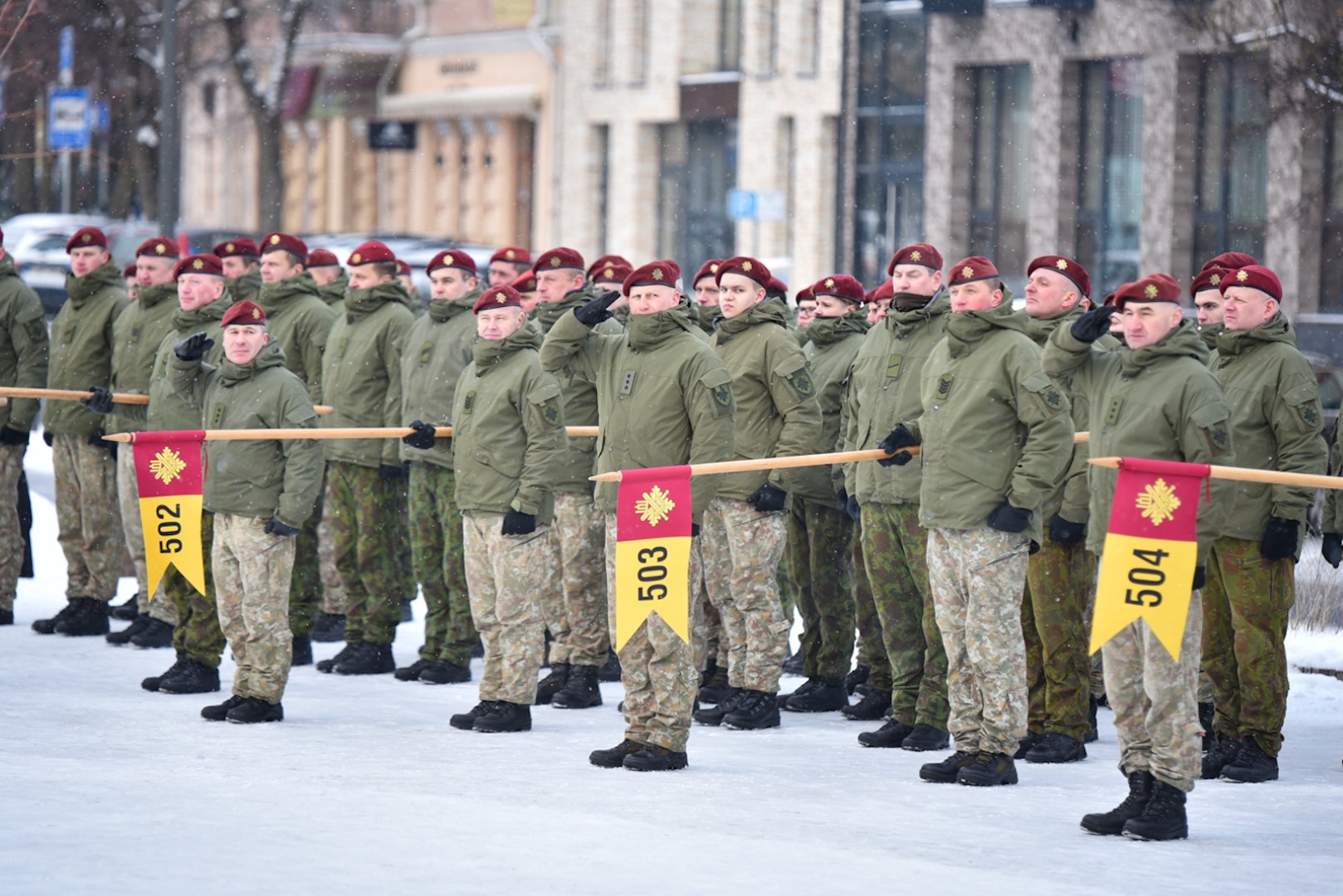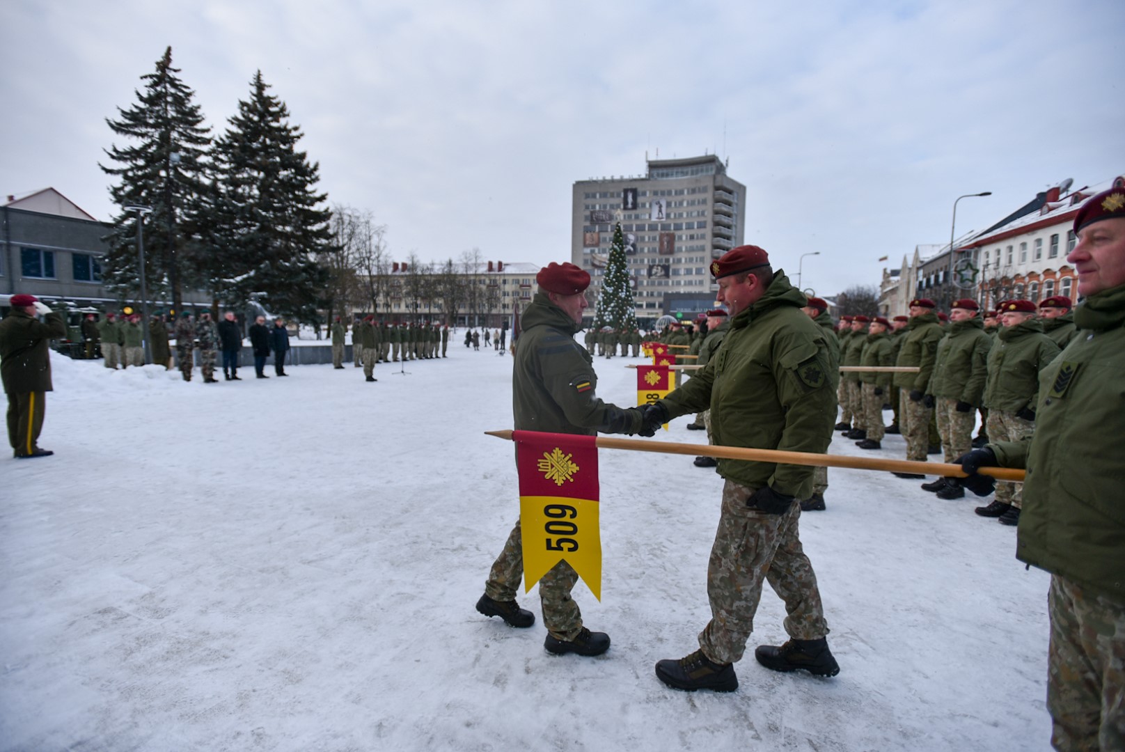 Krašto apsaugos savanorių pajėgų Vyčio apygardos 5-osios rinktinės vadas plk. ltn. Vidas Zabiela iškilmingai atsisveikino su Rinktinės kariais bei perdavė vėliavą naujai paskirtam rinktinės vadui mjr. Mindaugui Rekašiui.