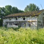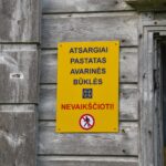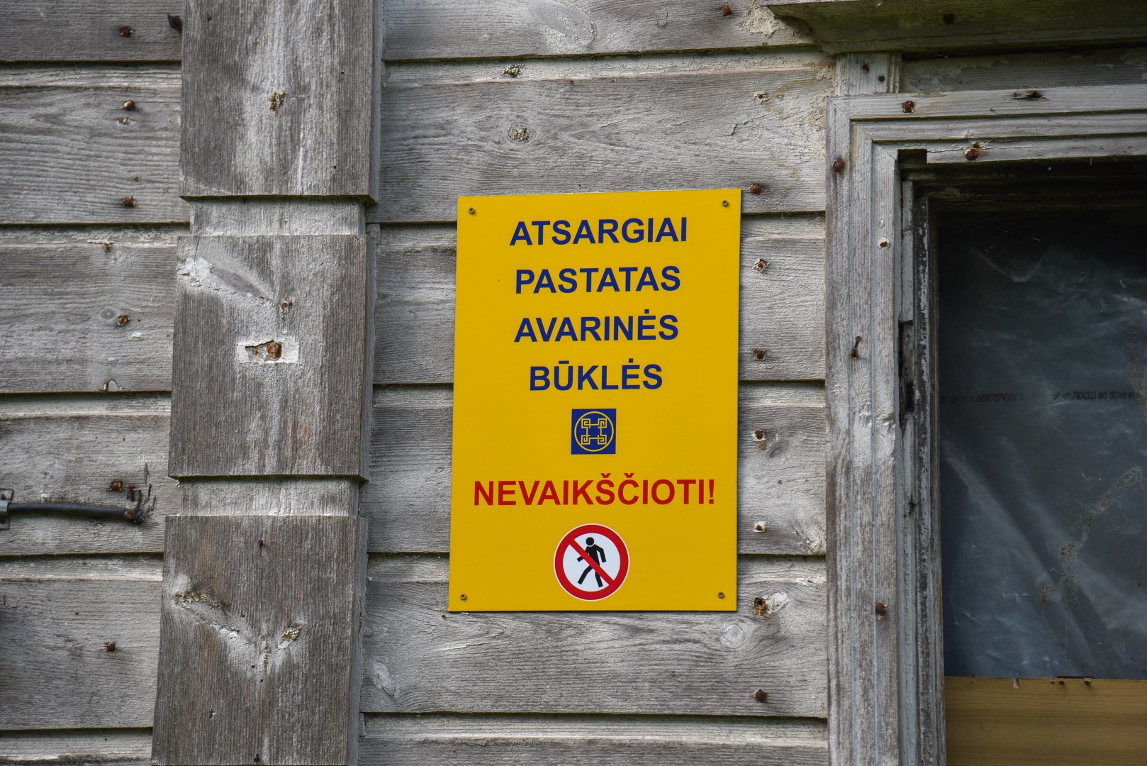 Ant rūmų liekanas juosiančios vielos tvoros kabo kitas užrašas, įspėjantis apie piktą šunį.