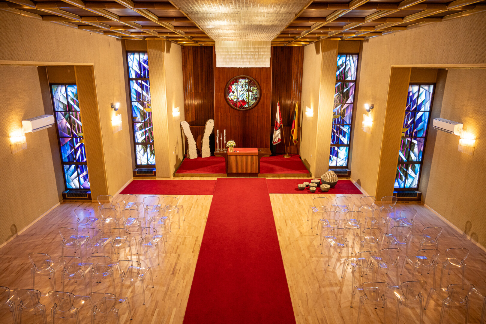 Šioje salėje devintajame dešimtmetyje įrengti penki žymaus Lietuvos dailininko, vitražininko Kazio Morkūno kūriniai liks tik jaunavedžių nuotraukose.