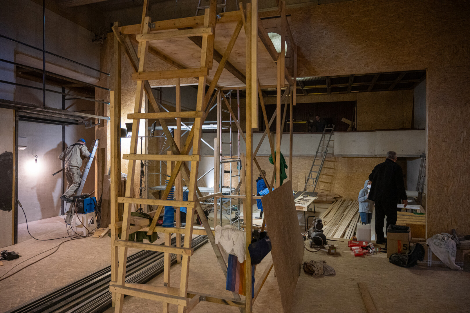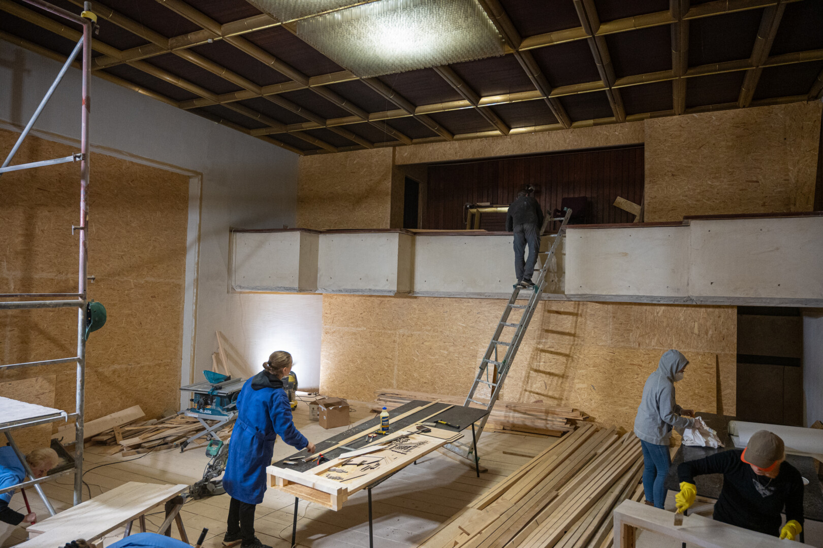 Būsimoje teatro salėje vedžiojama elektros instaliacija. Atsiras ir naujų šviestuvų, tačiau planuojama išsaugoti dalį senųjų.