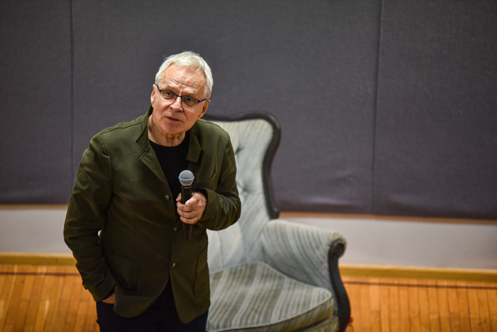 Susitikimas su V. Anužiu prasidėjo teatrologės D. Šabasevičienės klausimu, ką jis, V. Anužis, norėtų pasakyti savo mokytojui Juozui Miltiniui.