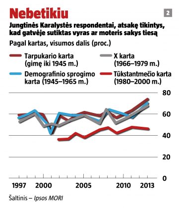 Tūkstantmečio karta – tai žmonės, kuriuos mažiausiai veikia politiniai pažadai. Pasak Bobby Duffy iš apklausas organizuojančios „IPSOS Mori“, jie daug rečiau nei demografinio sprogimo karta (gimusi 1946–1965 m.) arba X karta (gimusi 1966–1979 m.) tiki, kad kiti asmenys sakys tiesą (žr. grafiką). „Autentiškumas“ jiems – doros ir patikimumo ženklas, kaip, tarkime, rodo jų entuziazmas dėl telegeniškojo Kanados premjero Justino Trudeau. Bet, kai nėra asmeniškai patrauklių lyderių, nepasitikėjimas gali nemačia virsti cinišku pačios demokratijos vertinimu.
