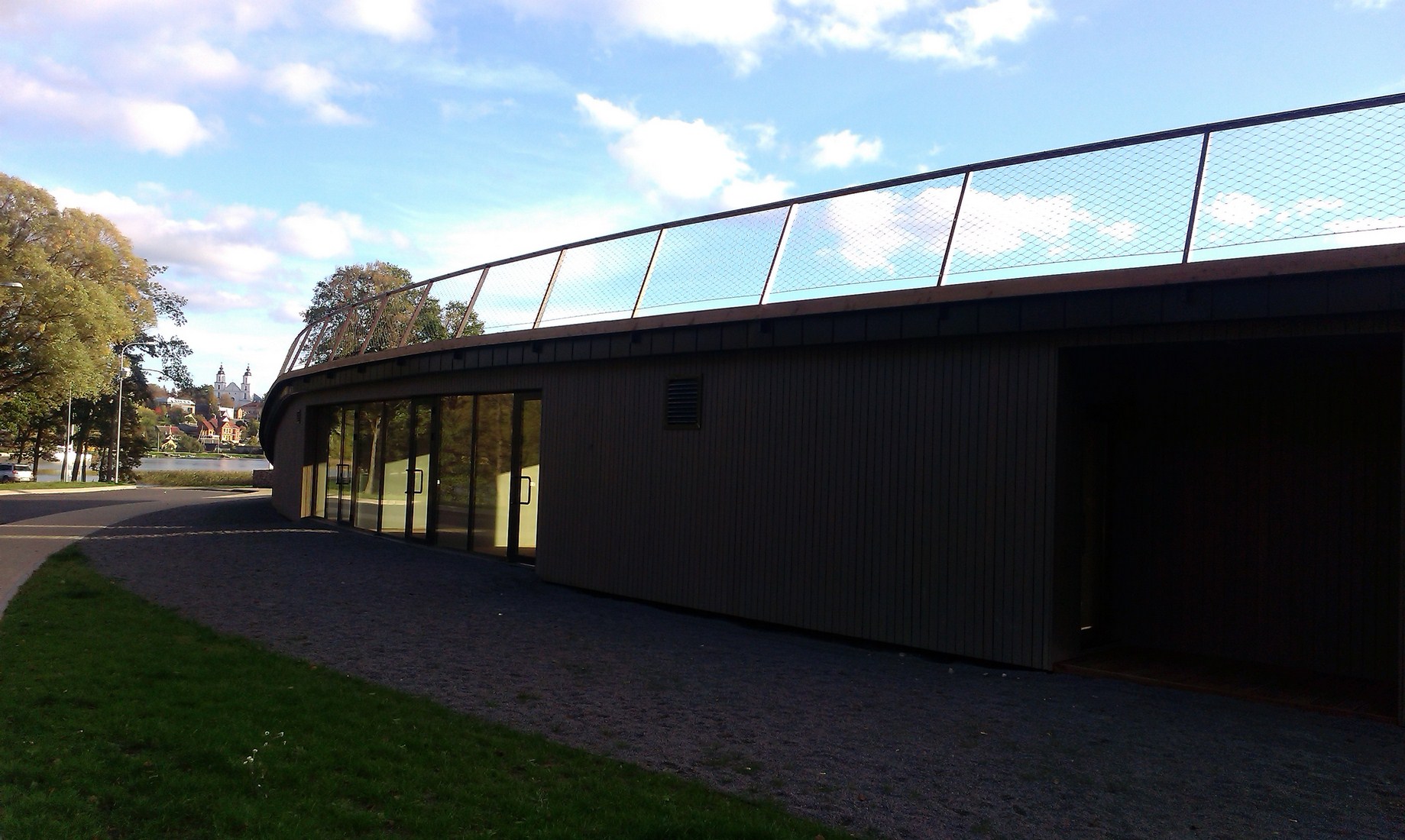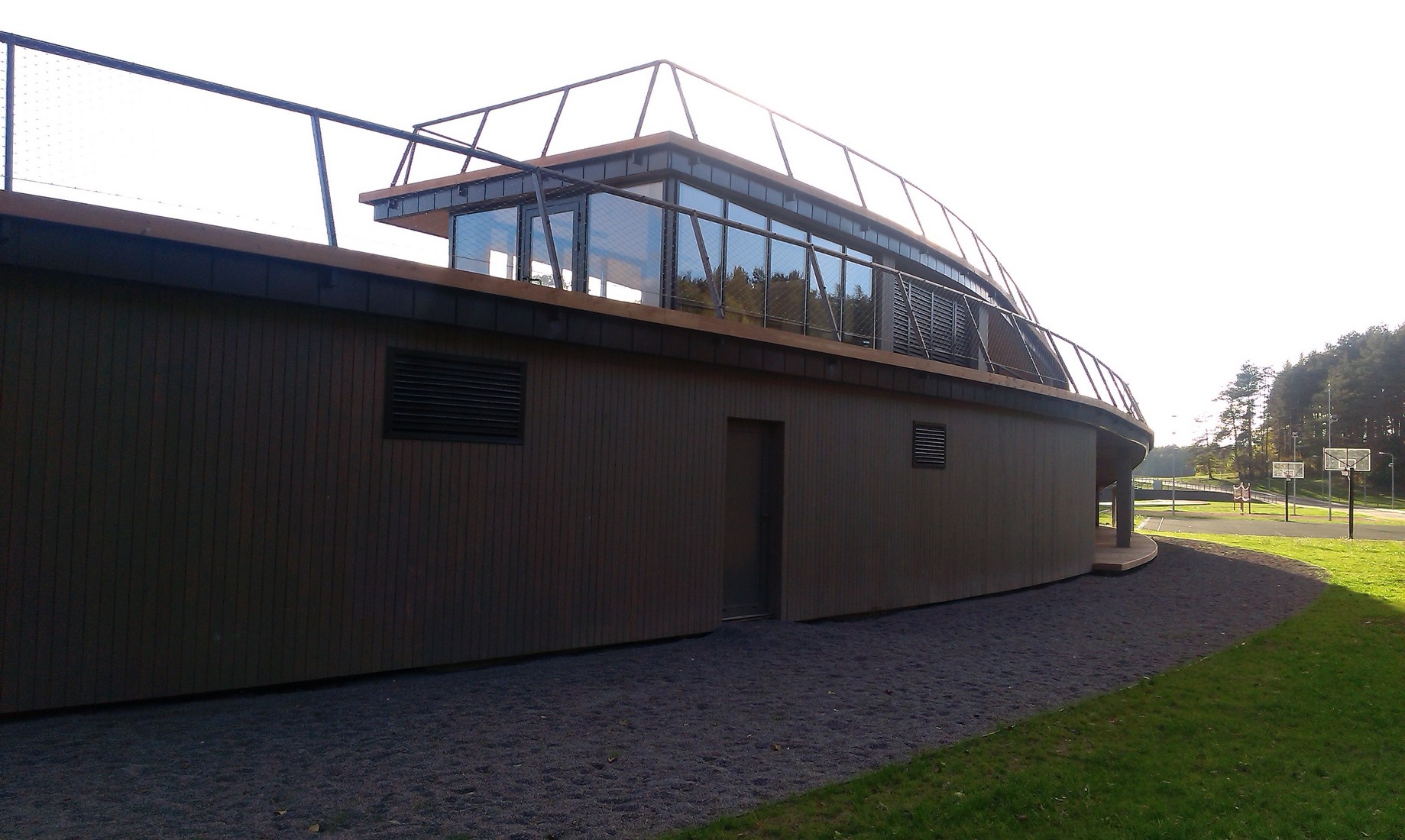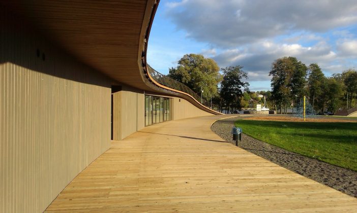 Architektai pasirinko susiliejimo su aplinka ir organiško jos papildymo kelią: dalis komplekso atsiduria žemiau privažiuojamojo kelio. Laikui bėgant pilkėjanti mediena įgaus daugiau gamtos atspalvių. Tokius pokyčius labai įdomu stebėti ne vien iš estetinės, bet ir iš praktinės pusės – kaip keičiasi maumedžio dangos savybės, ar sunku , brangu ją prižiūrėti ir ja naudotis? Tačiau turbūt labiausiai džiugina tai, kad išvengta regioninės architektūros imitavimo ir bandymų pritaikyti jos stiliaus elementus nebūdingai paskirčiai ir masteliui.