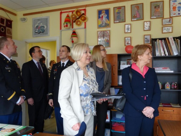 Mokyklos direktorė (viduryje) svečiams iš JAV ambasados aprodė patalpas, statytas JAV gynybinio bendradarbiavimo štabo EUCOM lėšomis. Pirma iš dešinės JAV ambasadorė.