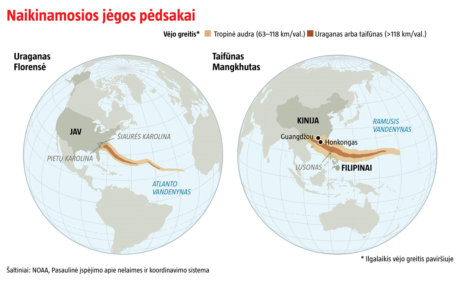 Pastarosiomis dienomis tolimi, kažkur giliai vandenyne prasidėję grumėjimai net dviem pasaulio kraštams atnešė katastrofiškų pasekmių. Amerikiečiai dar neatsigavo po uragano Florensės, rugsėjo 14-ąją pasiekusio Šiaurės Karoliną. O nepraėjus nė 12 valandų supertaifūnas Mangkhutas smogė Filipinams, vėliau užgriuvo Honkongą ir pietinį Kinijos kraštą. Mangkhutas buvo daug galingesnis – pasiekęs pirmą jam kelią pastojusią sausumą jis siekė penktą kategoriją, kai Florensė išsikvėpė iki pirmos. Bet abiejų atsiradimas sietinas su augančiais šiltnamio dujų kiekiais atmosferoje; dėl to keičiasi klimatas ir šyla jūra. Todėl ateityje galima tikėtis intensyvesnių audrų nei anksčiau.