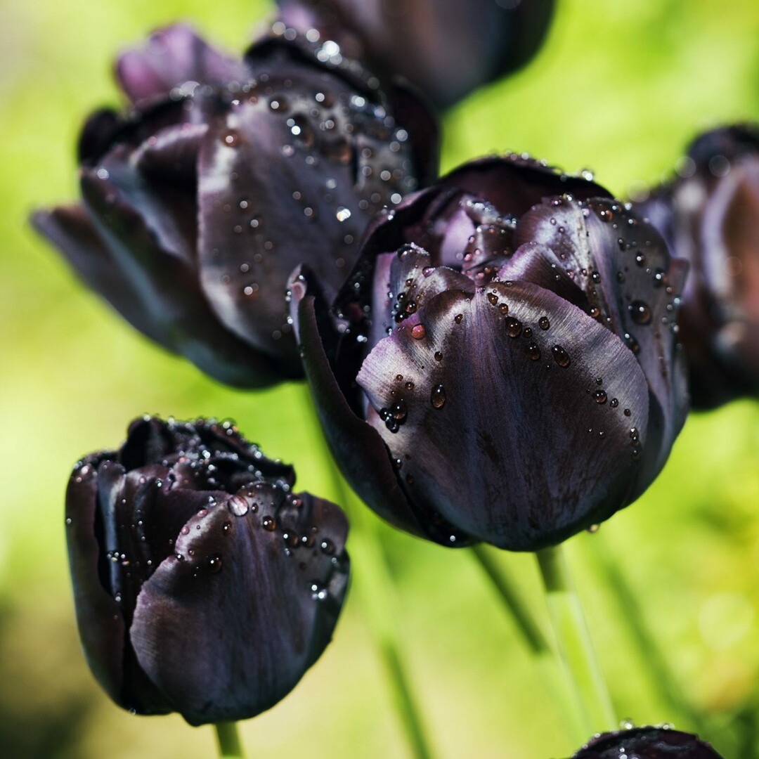 ‘Black Parrotʼ, arba vadinamosios papūginės tulpės, džiuginančios stambiais žiedais ant neaukštų tvirtų stiebų. Žiedlapiai aksominiai, garbanotais pakraščiais ir juodi su purpuro atspalviu. Žiedai pasirodo gegužės pradžioje, laikosi apie dvi savaites. Tinka merkti ir ankstyvam pražydinimui.