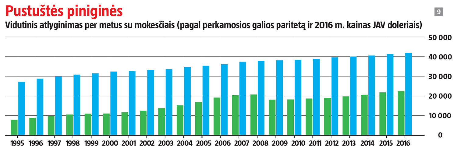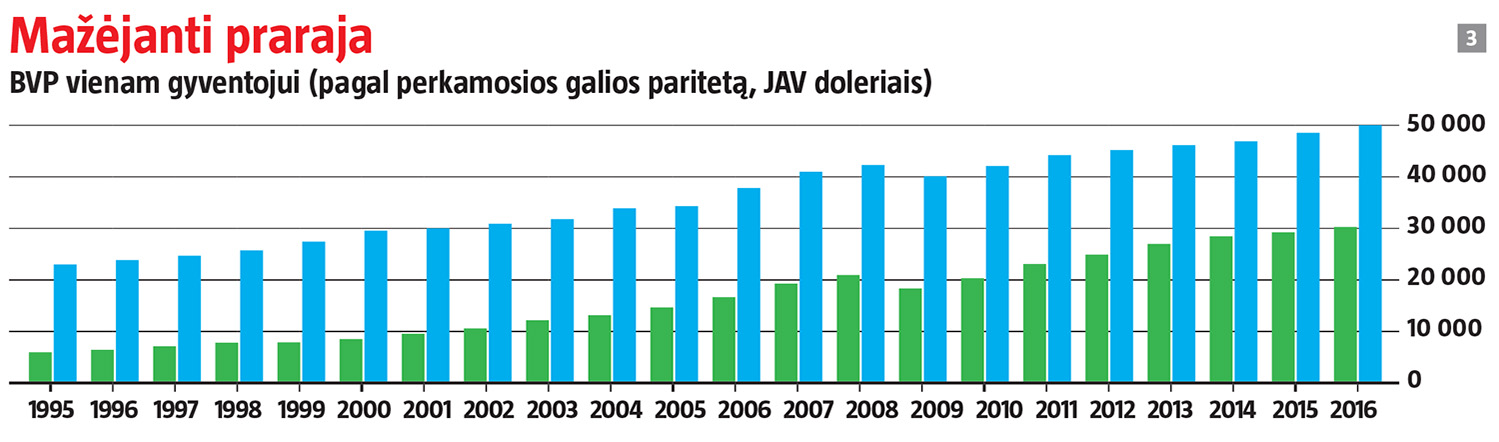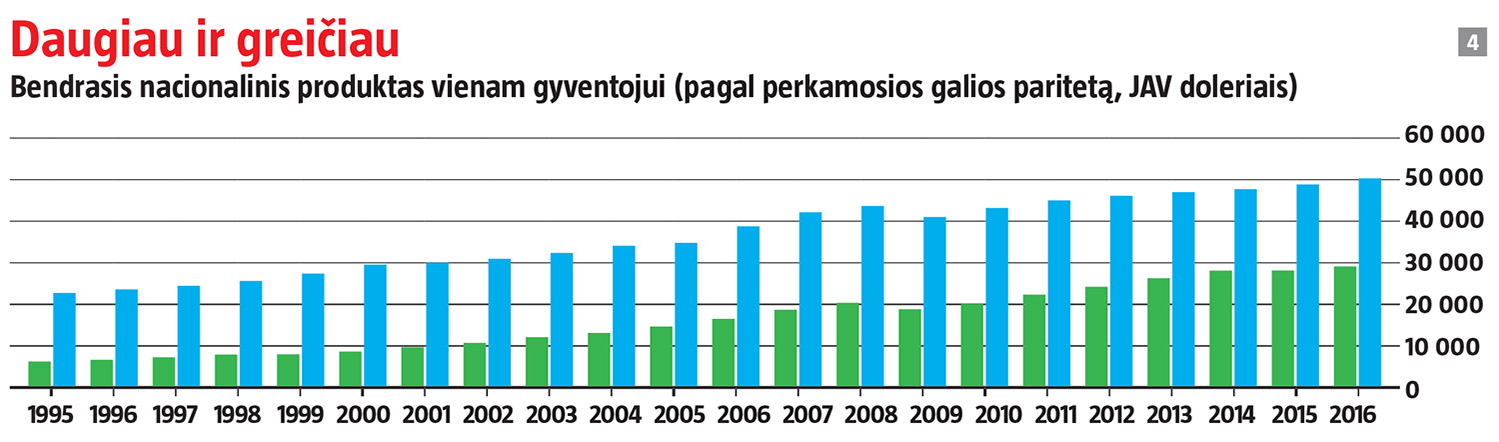 Pagal vieną populiariausių viešojoje erdvėje rodiklių, vienam gyventojui tenkantį bendrąjį vidaus produktą (BVP pagal perkamosios galios paritetą), svajonių Švediją, žvelgiant iš 1990-ųjų gūdumos, Lietuva jau aplenkė. 1995-ųjų šios valstybės lygį pasiekėme 2011 m. ir realiuoju laiku vis dar sparčiai artėjame – mūsų ūkis tebeauga dvigubai greičiau. Tačiau BVP ne visada tiesiogiai atspindi gyventojų piniginės, be to, gerovei nukalti svarbūs ir kiti veiksniai.