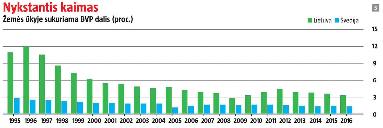 Valstybės modernumą iliustruoja žemės ūkyje sukurto BVP dalis – atsilikusiose šalyse ji gerokai reikšmingesnė, o išsivysčiusių valstybių ekonomikoje svarbesnis vaidmuo tenka aukštesnę pridėtinę vertę kuriantiems gamybos ir paslaugų sektoriams. Palyginti su Švedija, Lietuva vis dar agrarinė valstybė, tačiau šis atotrūkis irgi mažėja – 1995 m. skirtumas siekė keturis, o dabar – du kartus.