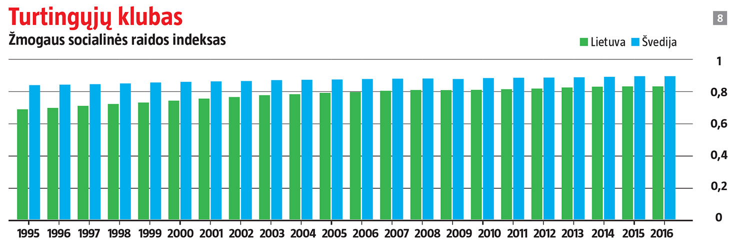 Žmogaus socialinės raidos indeksas irgi iliustruoja gerėjančią Lietuvos padėtį, nors stengtis dar yra kur – vidutinės gyvenimo trukmės rodiklis yra vienas blogiausių ES, pragyvenimo ar išsilavinimo lygis irgi turi kur augti.