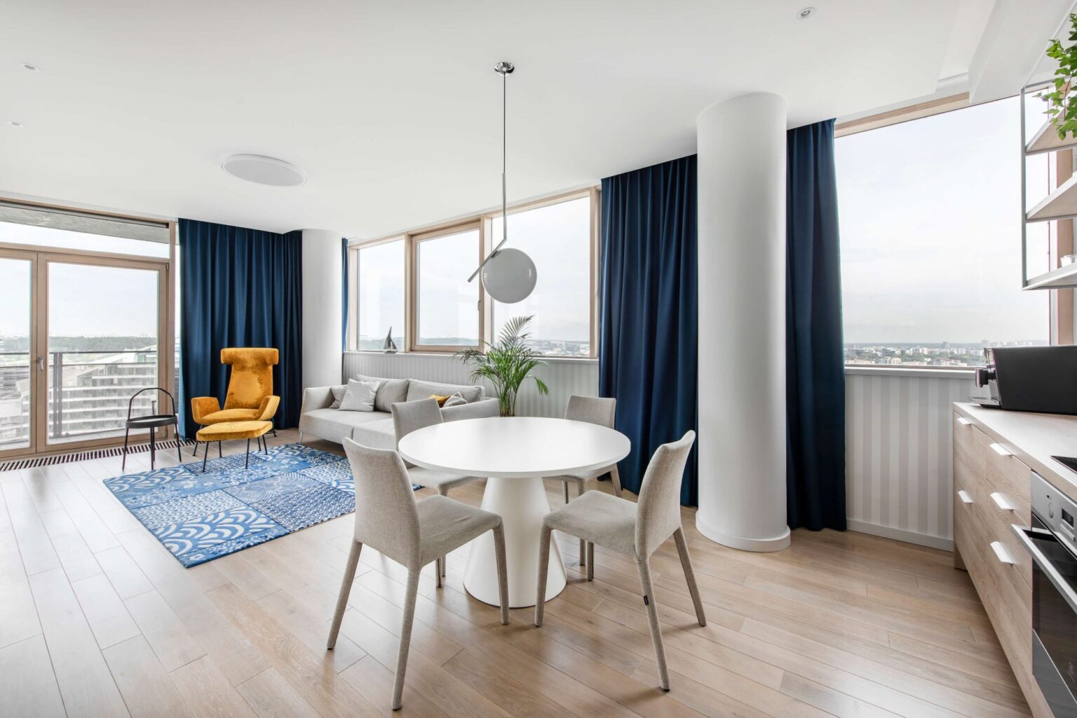 Pro beveik nepertraukiamą langų liniją atsiveriantys sostinės vaizdai ir natūralios šviesos srautai padiktavo lengvą interjero nuotaiką. Studijos „Idas“ interjero architektė Vaida Kandratavičiūtė subtiliam būsto koloritui energijos ir žaismingo kontrasto suteikė detalėmis – garstyčių spalvos foteliu ir dizainerės Florence Boural kurtu kilimu su stilizuotais japoniškais raštais.