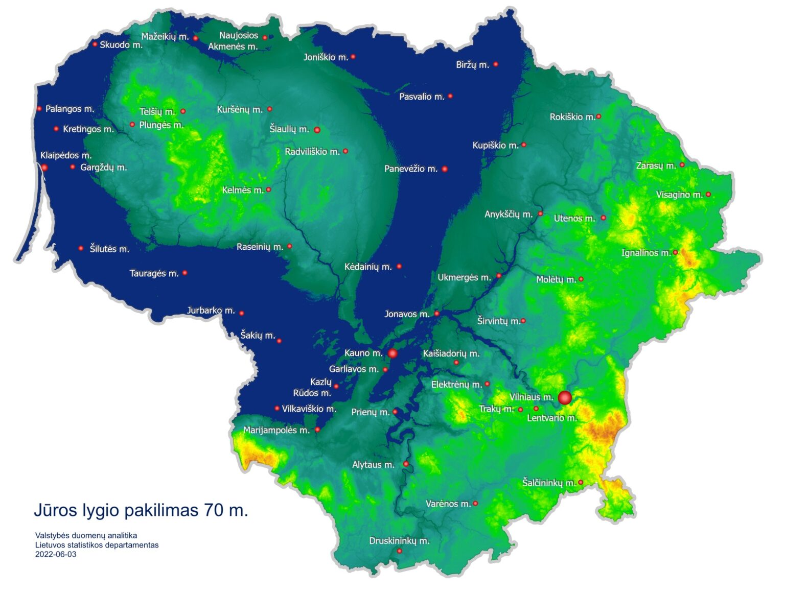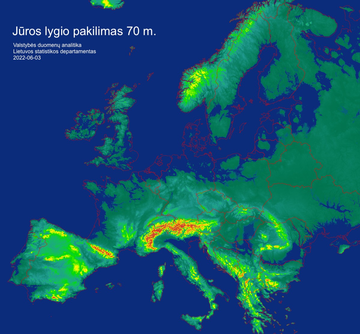 Valstybės duomenų analitika pateikė Lietuvos ir Europos žemėlapius, vaizduojančius, kaip pasikeistų dabartinė teritorija, jeigu jūros lygis pakiltų 70 metrų.