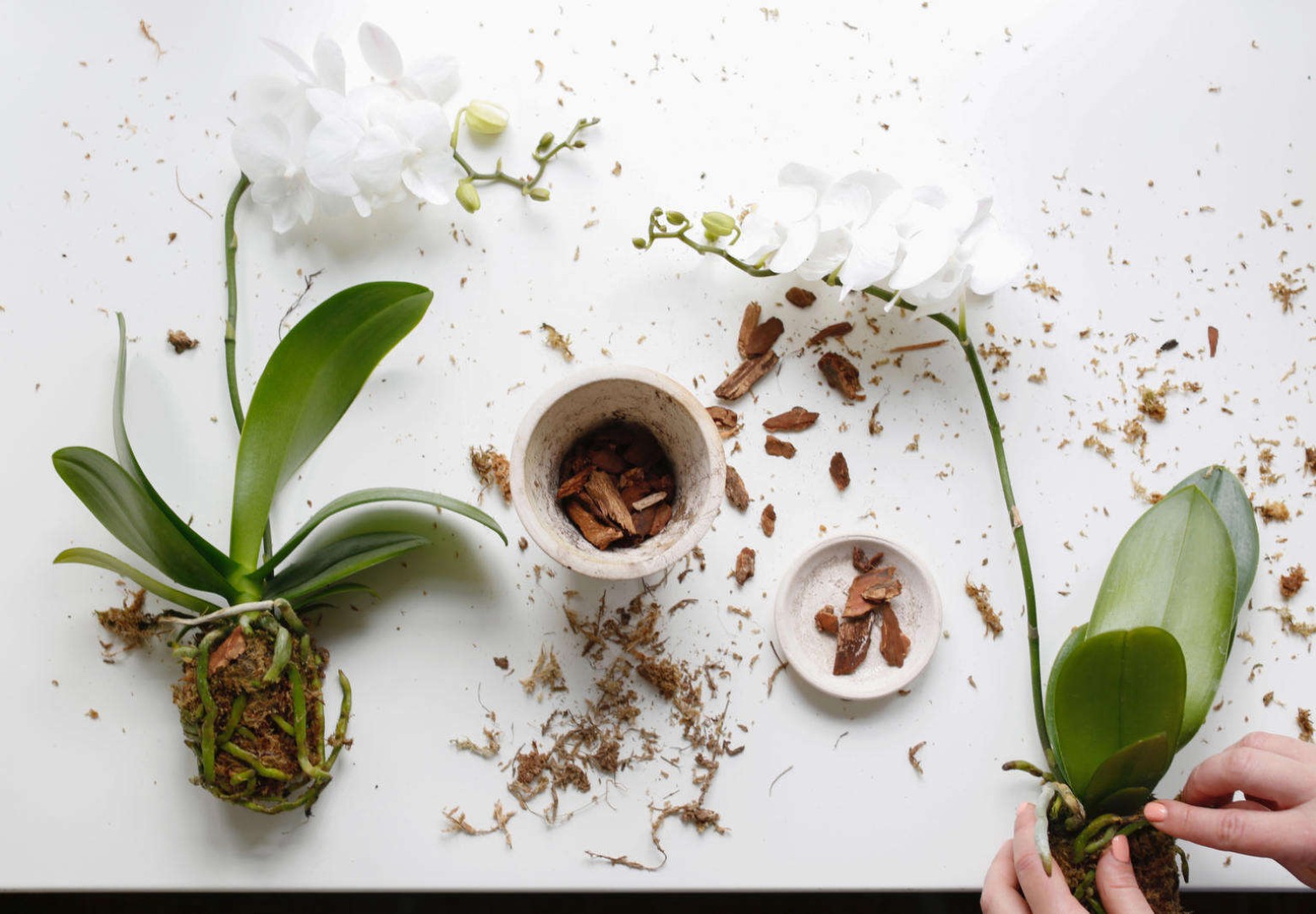 Išimkite orchidėją iš jos vazono ir švelniu šepetėliu nuvalykite šaknis. Būkite atsargūs, kad jų nepažeistumėte.