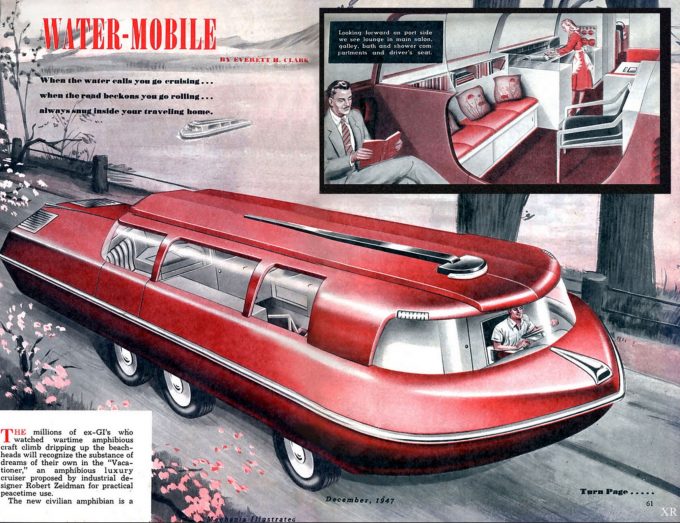 Žmonės visada norėjo, kad viena mašina padarytų viską. 1957 m. Žurnale „Mechanix Illustrated“ šį pašėlusį, mišrų amfibiją-visureigį sugalvojo populiarus iliustratorius Frankas Tinslis.
