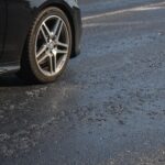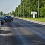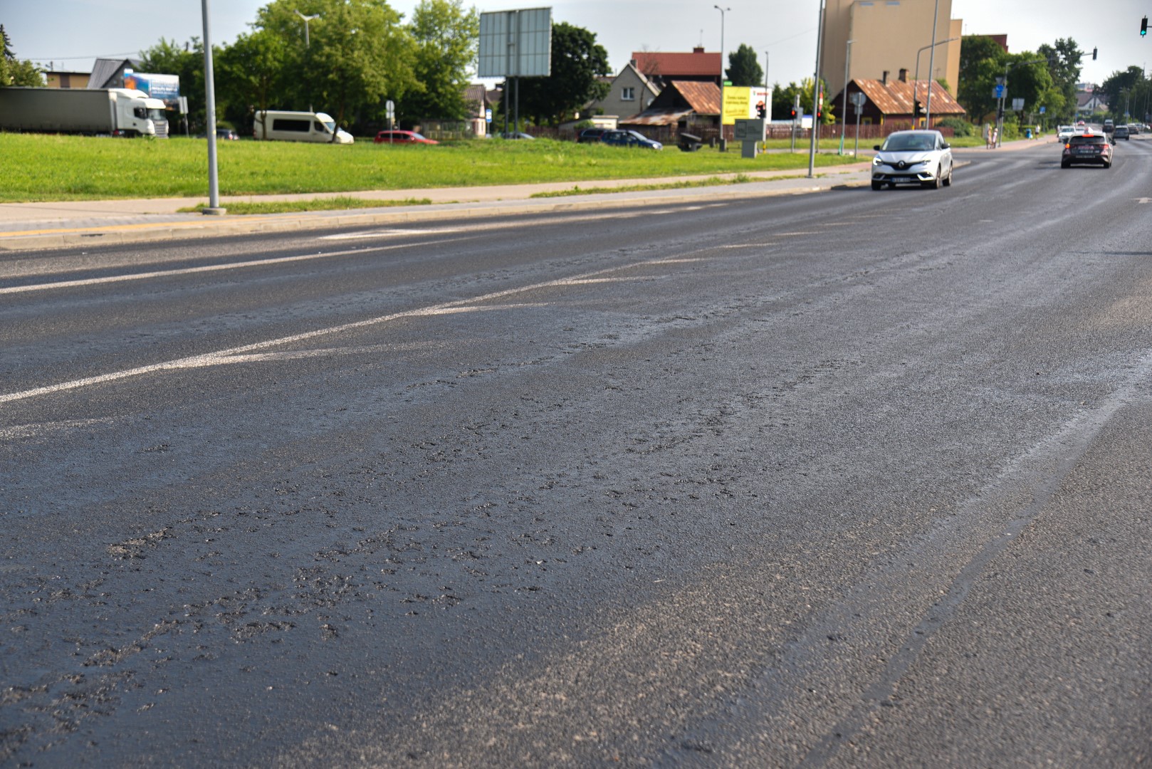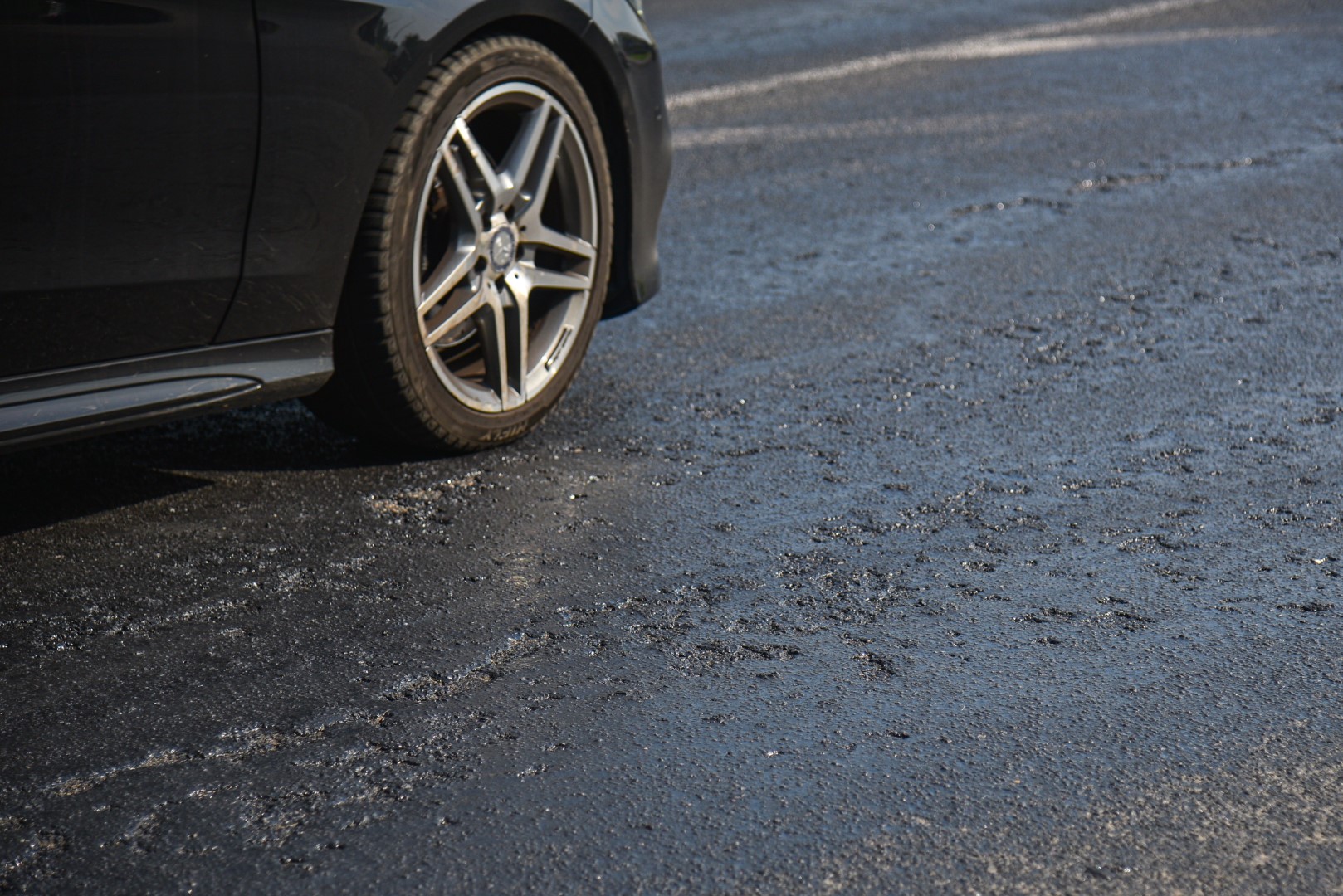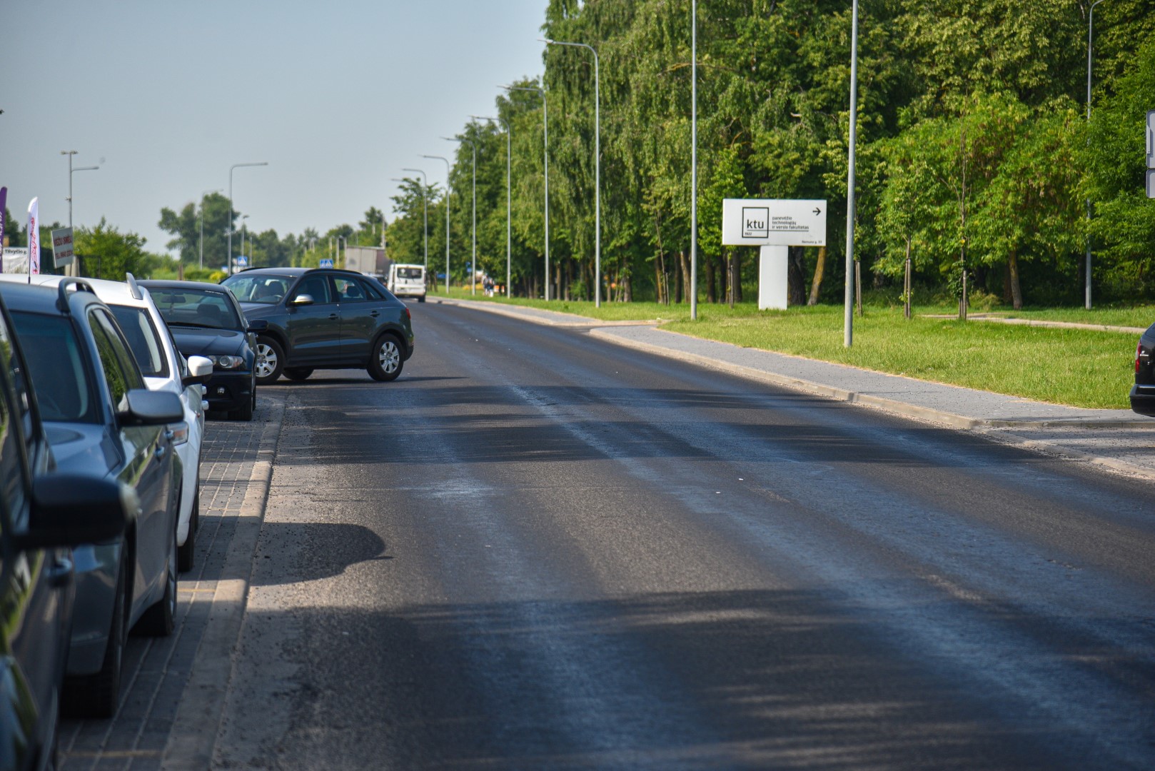 Panevėžiečiai pastebėjo, kad važiuojant J. Tilvyčio gatve link žiedinės sankryžos automobilių ratai limpa prie dangos, netgi automobilių apačia apsitaško lipnia medžiaga. P. Židonio nuotr.
