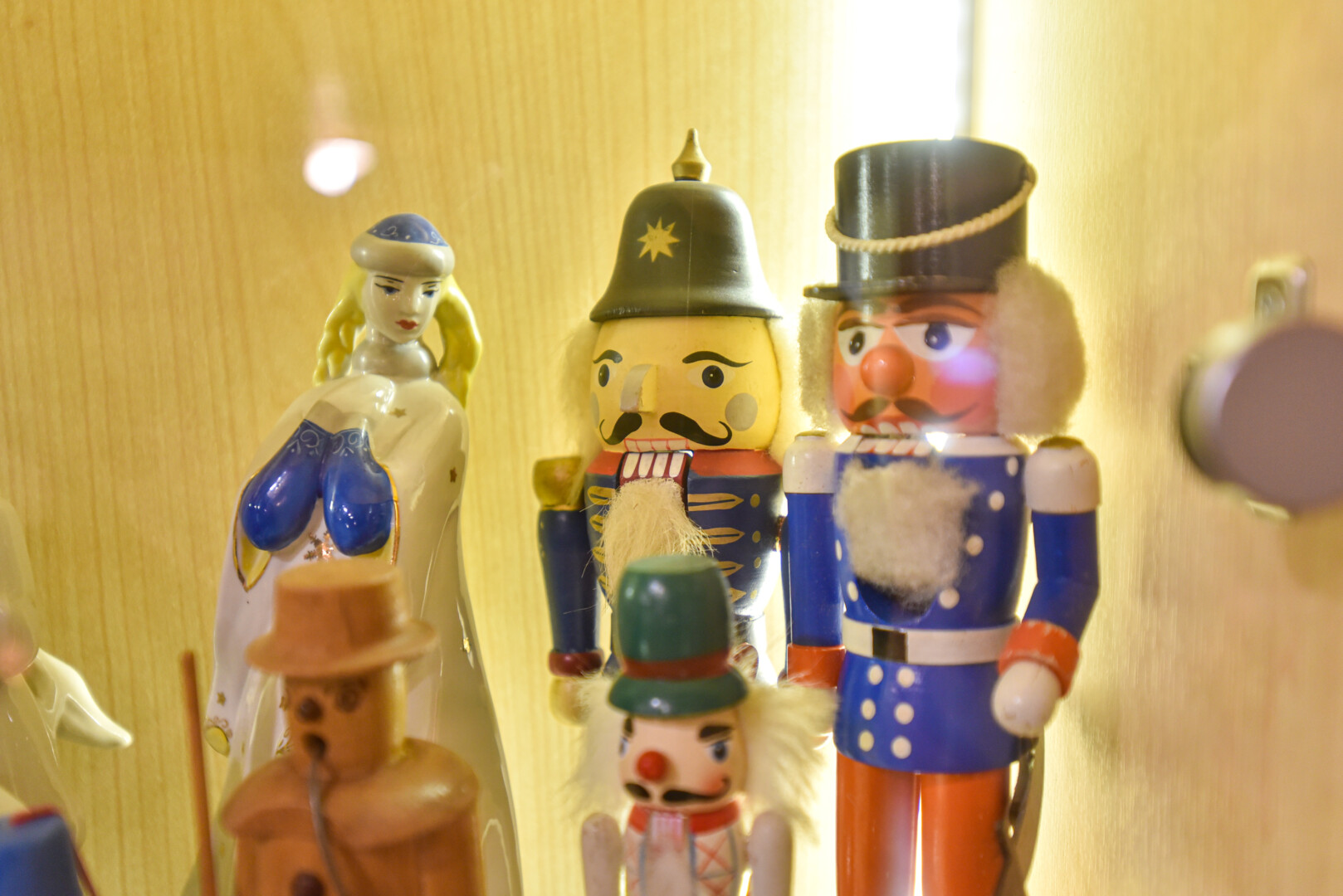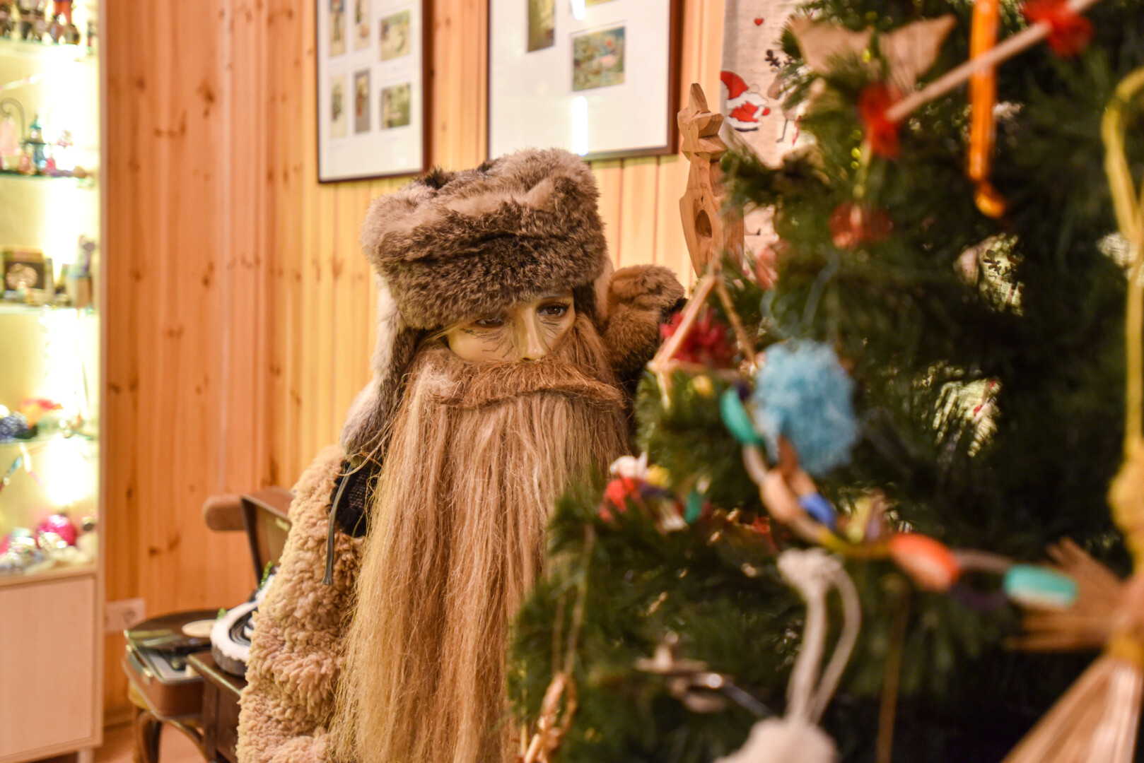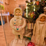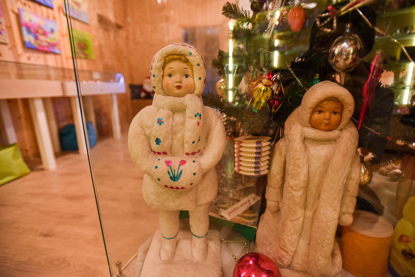 Muziejaus centre po stiklu iš tolo akį traukia dvi nemažo ūgio snieguolės ir Kalėdų Senelis, pagaminti iš vatos ir popieriaus, tik veidukai keraminiai, o puošmenos, primenančios tradicinius tautinius raštus – iš folijos.