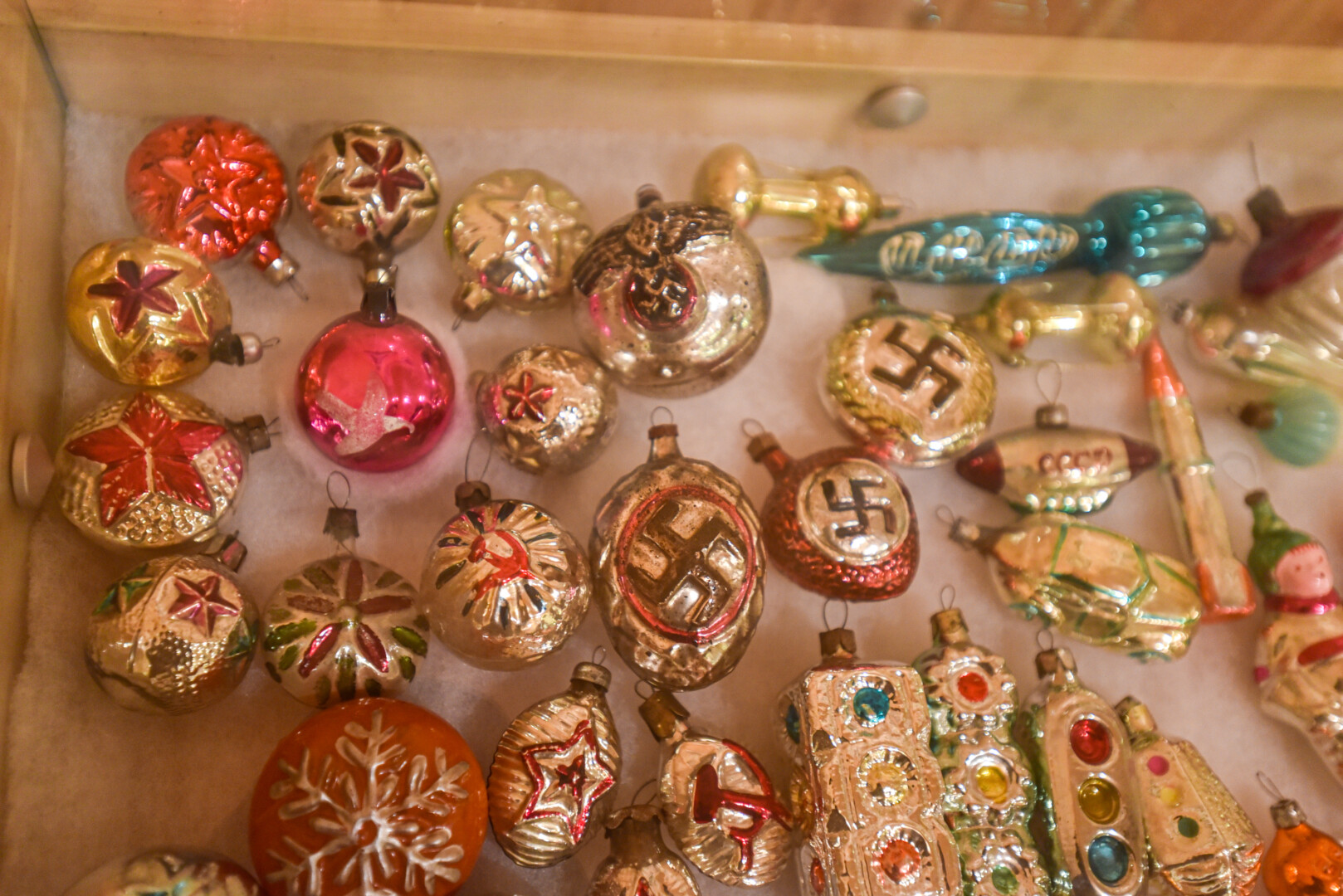 Tarp muziejaus eksponatų ir dabar keistai atrodo eglės žaislai su penkiakampėmis žvaigždėmis, nacistiniais ereliais ir panašia atributika.