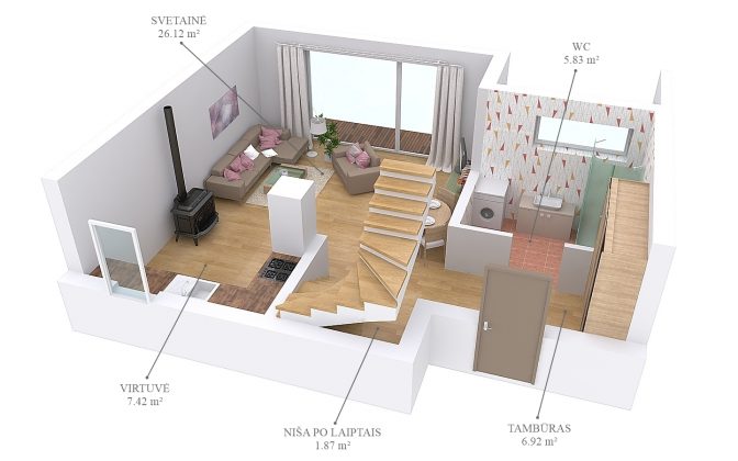 Tambūre, sanitariniuose mazguose ir virtuvės zonoje iki 18 m2 – plytelės, kitur laminatas.