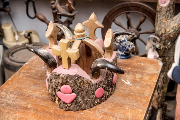 Mindaugas ir Morta – tai tik įžanga į karališkos tematikos A. Kutrevičiaus darbų kolekciją. Ant dirbtuvių durų pakabinti visi valstybės valdovui reikalingiausi atributai – kardas, karūna, sveikintis tiesiasi ir paties karaliaus ranka, padabinta didžiuliu žiedu. Šalia – žaismingas užrašas „Labas“.