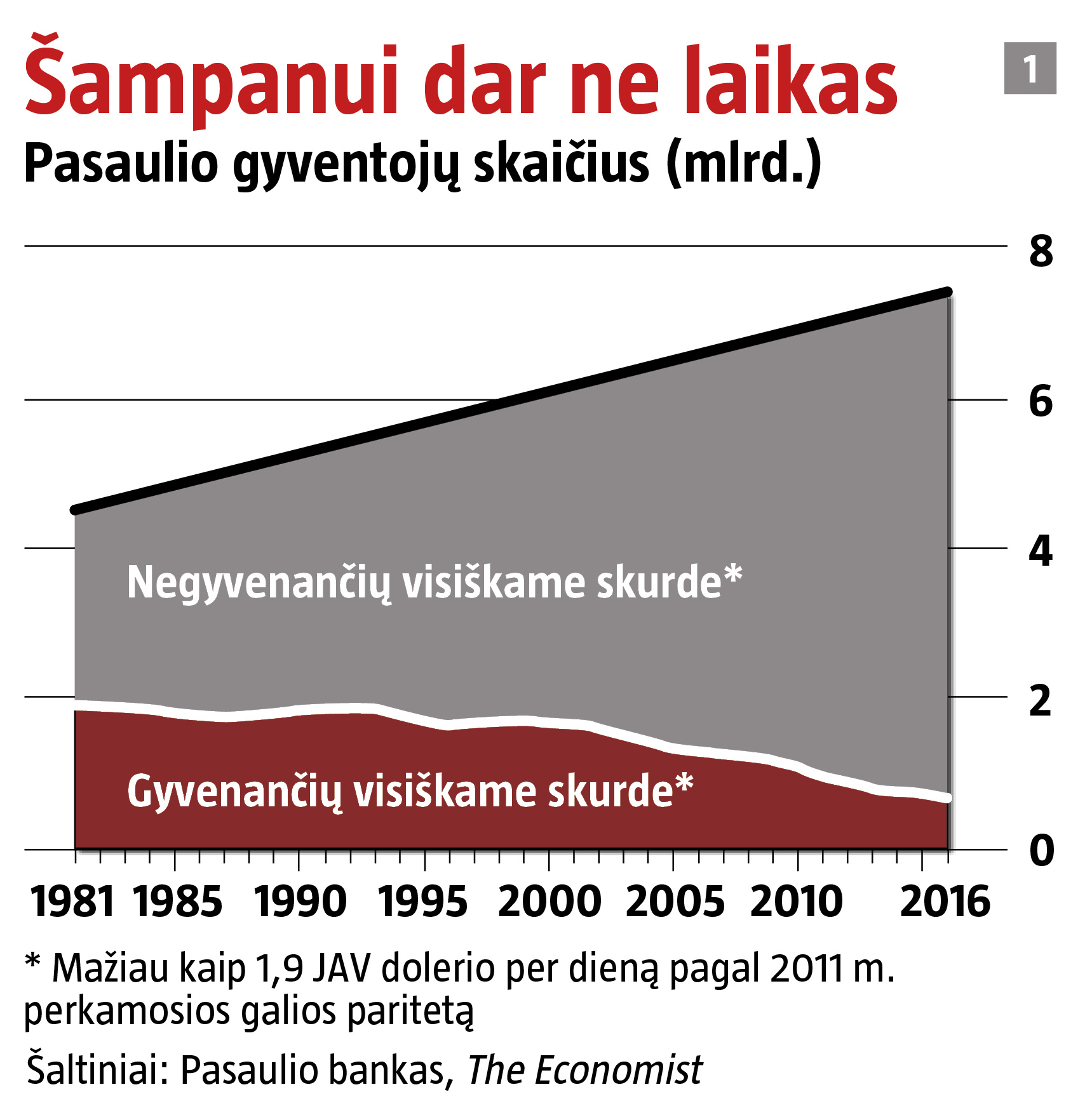 Tikintiems, kad anksčiau pasaulis buvo geresnis, o ypač tvirtinantiems, jog globalizacija padarė daugiau ekonominės žalos, nei atnešė naudos, nesunku paprieštarauti – užtenka parodyti 1 grafiką. Pasaulio banko duomenimis, 1981 m. visiškame skurde gyveno apie 42 proc. pasaulio žmonių. Jie ne tik vertėsi sunkiau už daugumą tėvynainių, kaip šiandien daugelyje turtingųjų šalių apibrėžiamas piliečių skurdas, bet buvo visiški varguoliai. Geriausiu atveju jie šiaip ne taip sukrapštydavo pinigų pavalgyti ir būtiniausiems pirkiniams, pavyzdžiui, drabužiams. Blogiausiu – badavo.