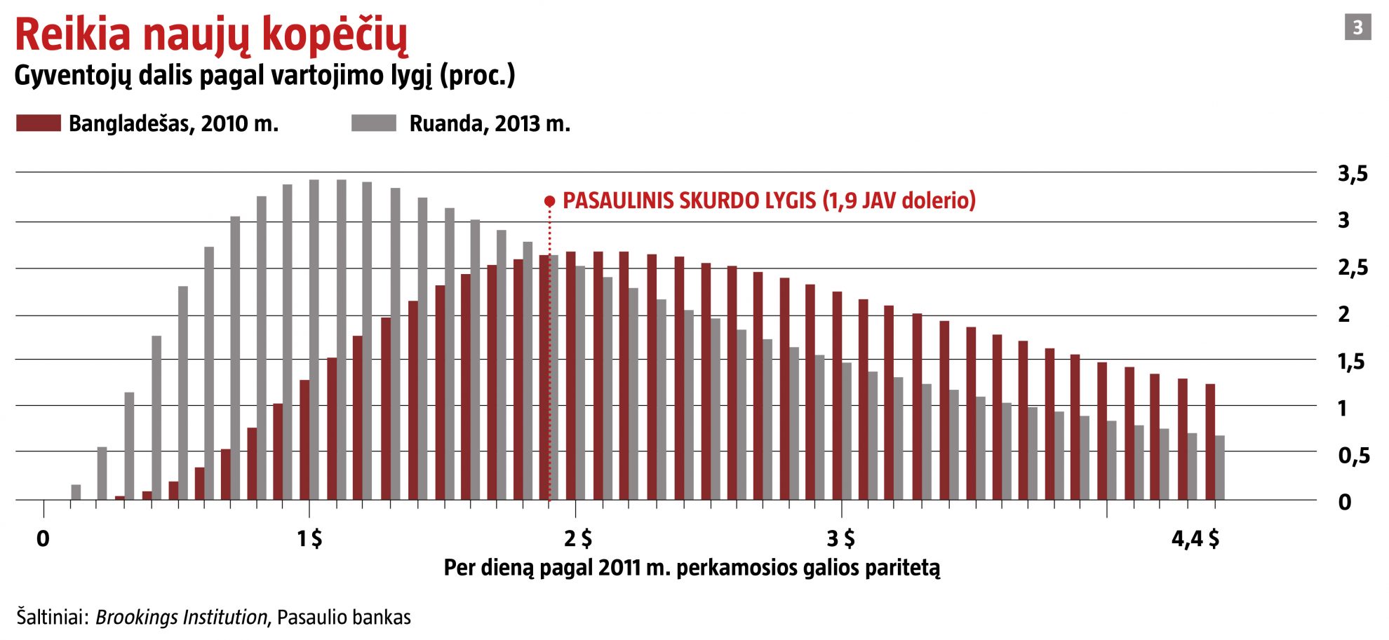 Trečia, Afrikoje skurstantys žmonės paprastai yra tikri varguoliai. Palyginkime Ruandą ir Bangladešą. Abiejose šalyse pajamos mažos, abi valdomos palyginti kompetentingai, abiejų ūkis keletą metų auga. Bet Ruandos skurdžiai yra daug neturtingesni už nepritekliaus kamuojamus bangladešiečius. Dažnas turi išsiversti su maždaug doleriu per dieną (žr. 3 grafiką). Įsivaizduokime, anot Laurence’o Chandy iš UNICEF, kad Ruandos ūkio prieaugis dešimt metų sieks 5 proc. vienam gyventojui kasmet ir pasiskirstys tolygiai. Po tokio įspūdingo laikotarpio ketvirtis ruandiečių tebegyventų žemiau visiško skurdo ribos.