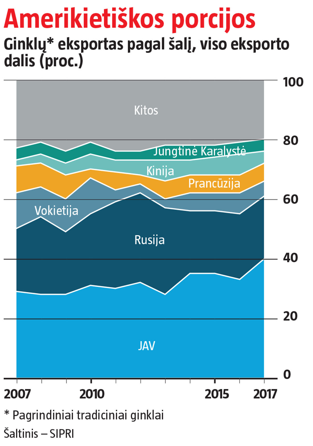 Iš pirmo žvilgsnio keista matyti JAV nuogąstavimus. Yra keli ginklų rinkos vertinimo parametrai ir pagal visus juos šalis – pirmoje vietoje. SIPRI nagrinėjo tarp valstybių judančius ginklų kiekius, pasirinkusi penkerių metų laikotarpį iki gruodžio, taip pat duomenis palygino su ankstesniu penkerių metų laikotarpiu (žr. grafiką).