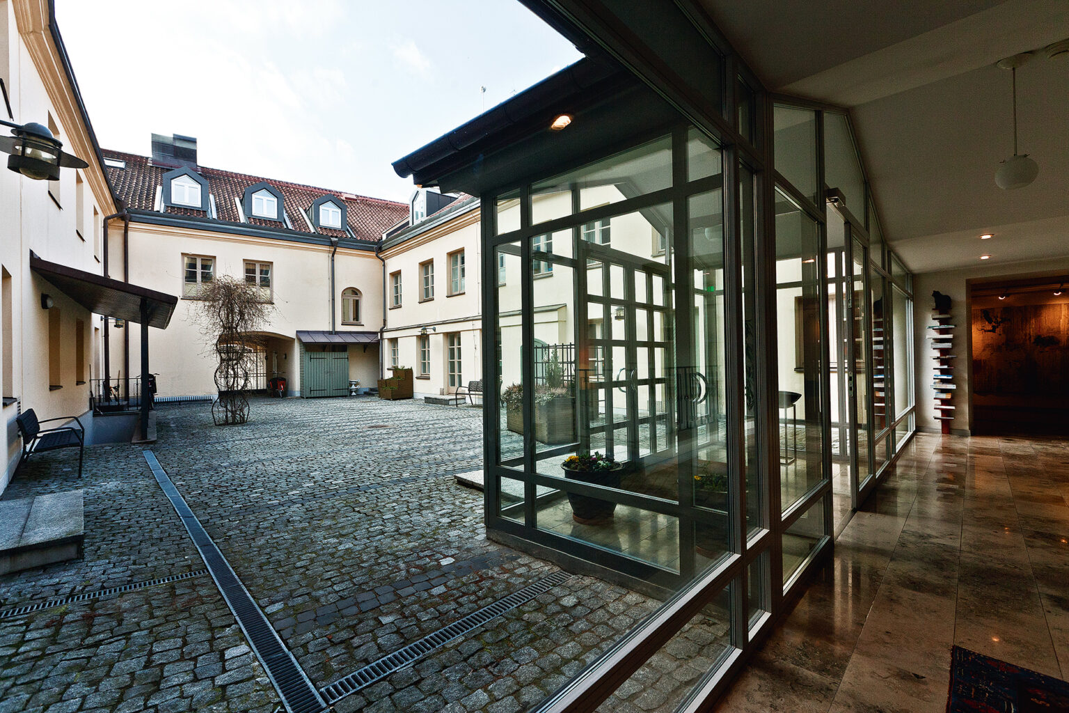 Švedų kūrėjų baldai, šviestuvai, interjero detalės ir Vilniaus senamiesčio architektūros bruožai rezidencijoje sukuria dizaino albumų vertą derinį. Įžengęs į jos biblioteką iš pradžių net nepajunti, kad čia trūksta svarbaus jaukių namų elemento – natūralios šviesos šaltinio. Langų bibliotekoje nėra, užtat prieš akis atsiveria raudonų plytų gotikinės arkos, tampančios svarbiausiu kambario akcentu. Tai – seniausia ambasados ir rezidencijos ansamblio dalis, išlaikiusi ne tik autentišką lubų formą, bet ir kelias sienose esančias nedideles nišas. Jų paskirtis paaiškėjo visai neseniai: ambasadoje viešėdami architektai atskleidė, kad šias nišas kadaise miestelėnai naudojo kaip seifus – čia laikė vertingiausius daiktus.