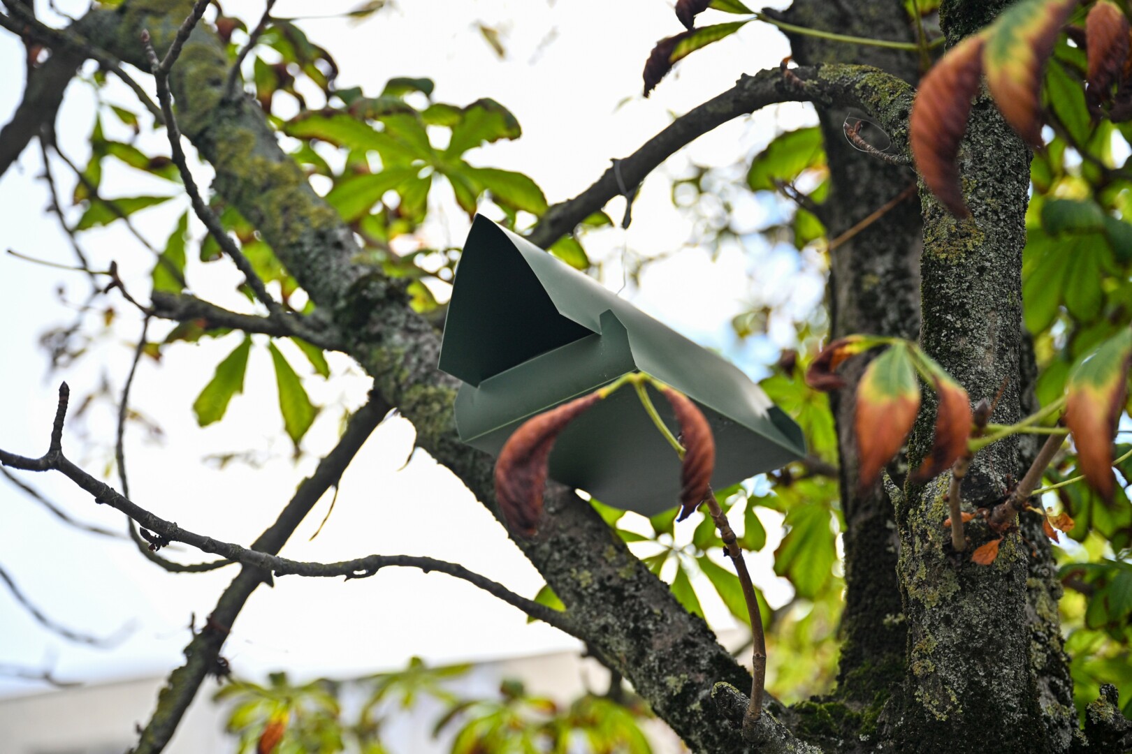 Tam naudojamos į medžius sukabintos feromonų gaudyklės.