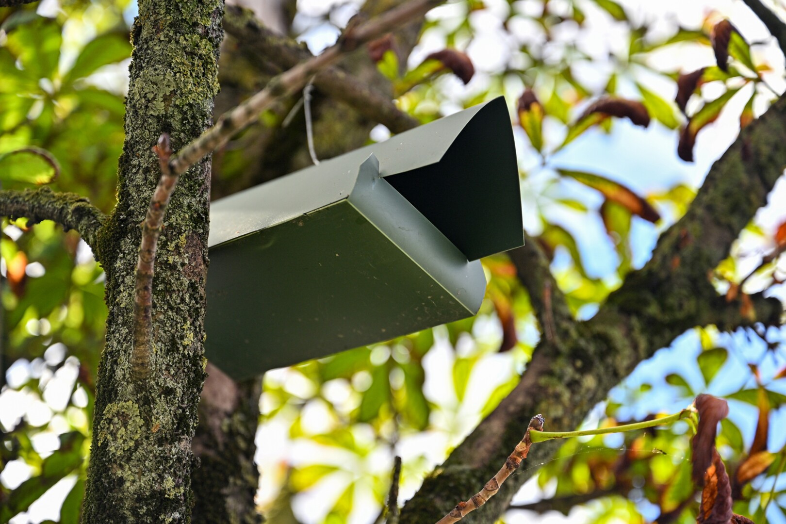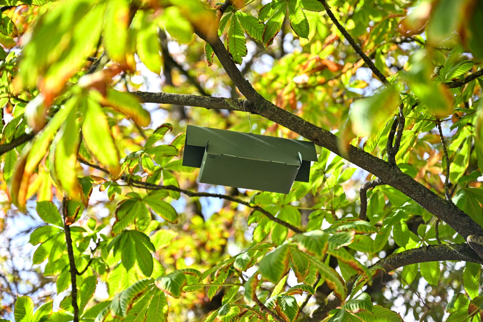 Visą vasarą Panevėžio centre akylesni praeiviai mato ant kaštonų šakų siūbuojančius žalius, iš pirmo žvilgsnio paukščių lesyklėles primenančius namelius.