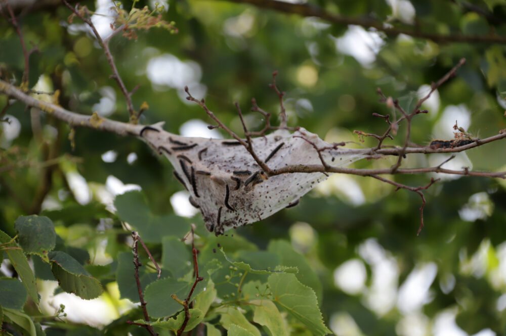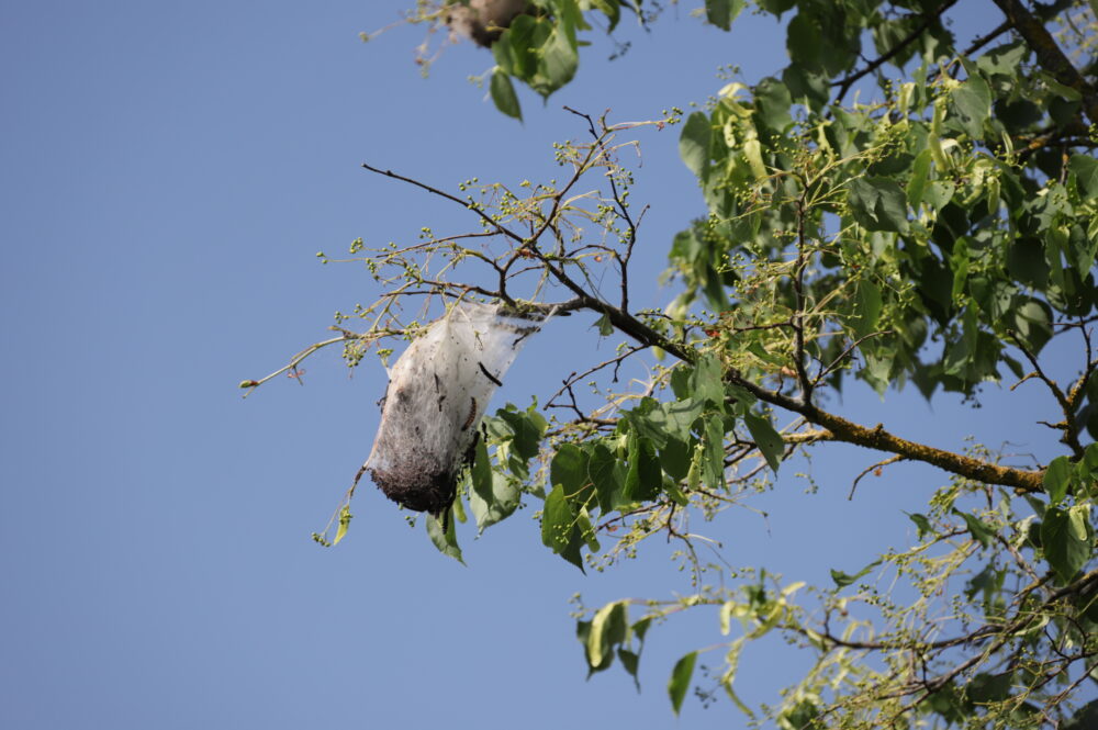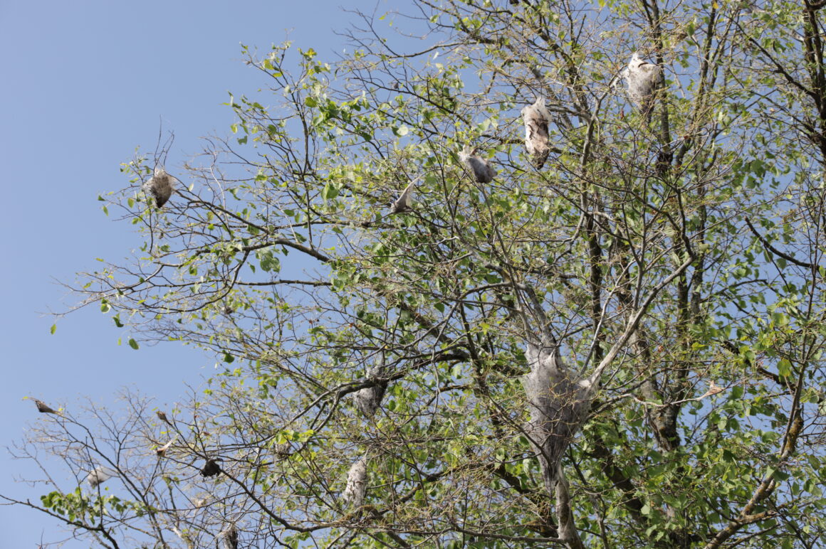 „Ten tokie balti iš voratinklio susukti kaip ir vokai, kaip ir kokonai. Jų viduje pilna didesnių – iki penkių centimetrų ir visai mažų kirminų. Jie išlenda ėsti medžio lapų ir paskui grįžta atgal. Kažkas panašaus į vapsvų spiečius, tik čia kirmėlės“, – apie atgrasiai atrodančiais lizdais tankiai aplipusius medžius pasakojo J. Vidugirytė.