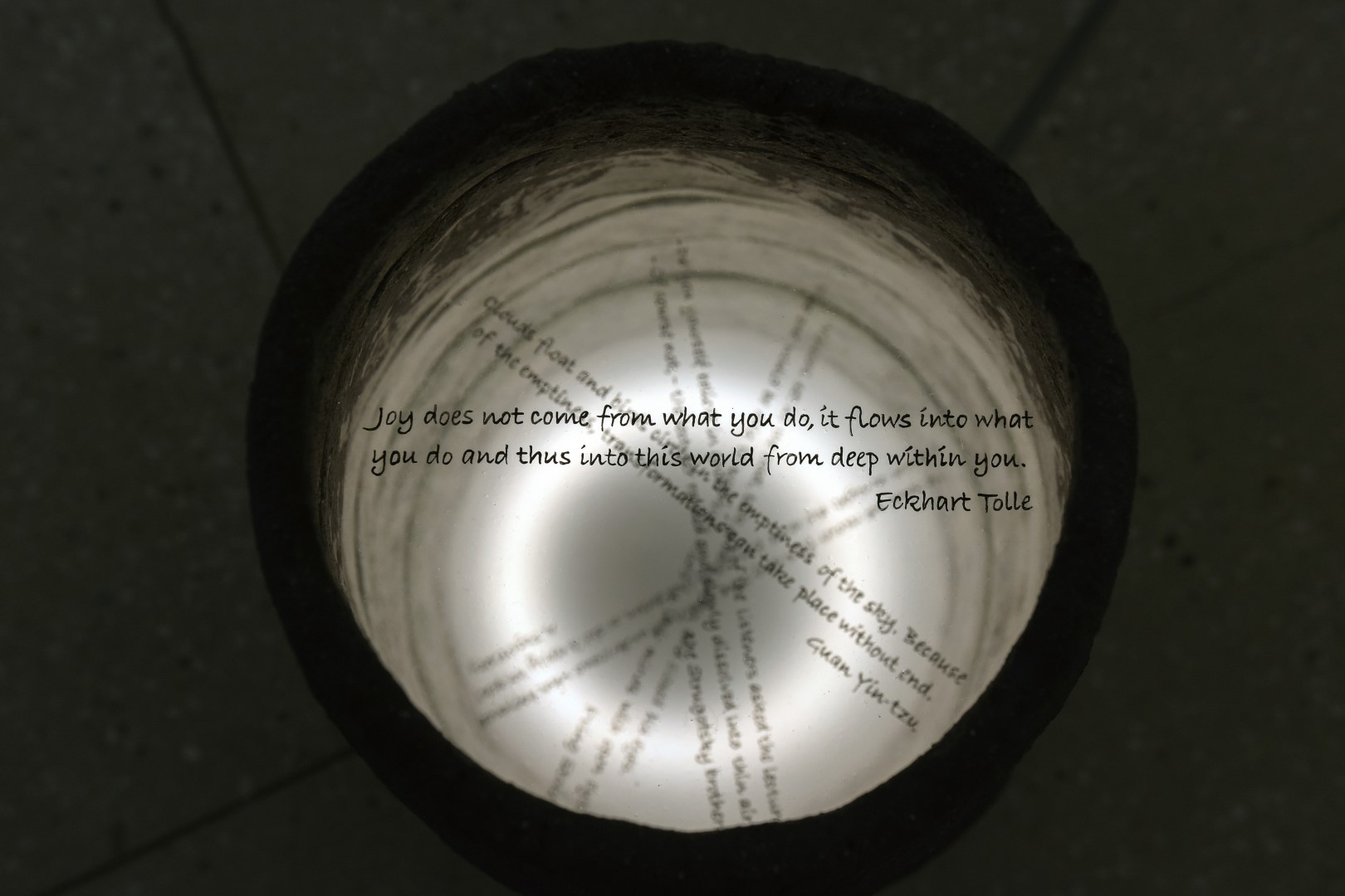 „Tai gelmė, į kurią mes galime žingsnis po žingsnio panirti. Šis atminties indas stovi ant grindų taip, kad į jį galima būtų pažvelgti iš viršaus ir savo suvokimą panardinti į vidų. Jis tamsios spalvos, nes mūsų praeitis slūgso giliai pasąmonės tamsoje, bet mes galime jį nušviesti savo dėmesiu ir įžvelgti pačius giliausius prisiminimų sluoksnius. Taigi indo viduje slypi šviesa. Permatomi paviršiai su užrašais indo viduje – tai vandens sluoksniai, kuriuose saugoma informacija iš įvairių gyvenimo periodų. Tai lyg paslaptingas senovinis šulinys, pripildytas prasmių. Gali būti, kad keleiviui, kuris eis pro šalį, kokia nors citata galės pasirodyti artima ir padės jam kažką pajausti, suvokti ar prisiminti“, – sako autorė.