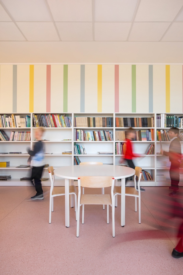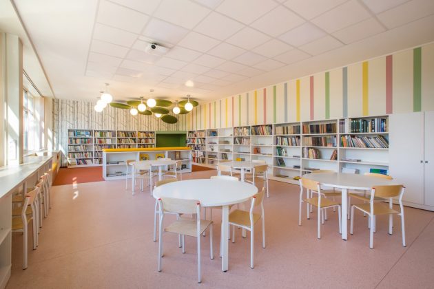 Bibliotekos erdvė padalinta į dvi funkcines zonas. Vienoje stovi stalai, kėdės, todėl prireikus čia galima vesti pamokas. Specialiai tam pastatytas projektorius ir palikta tuščia balta siena. Nuo bibliotekos šią zoną skiria ir ramesnės spalvos bei šviesaus linoleumo grindys. Nuo linoleumo nužengęs ant kilimo patenki į skaityklą, kurioje viskas minkščiau, žemiau ir spalvingiau.